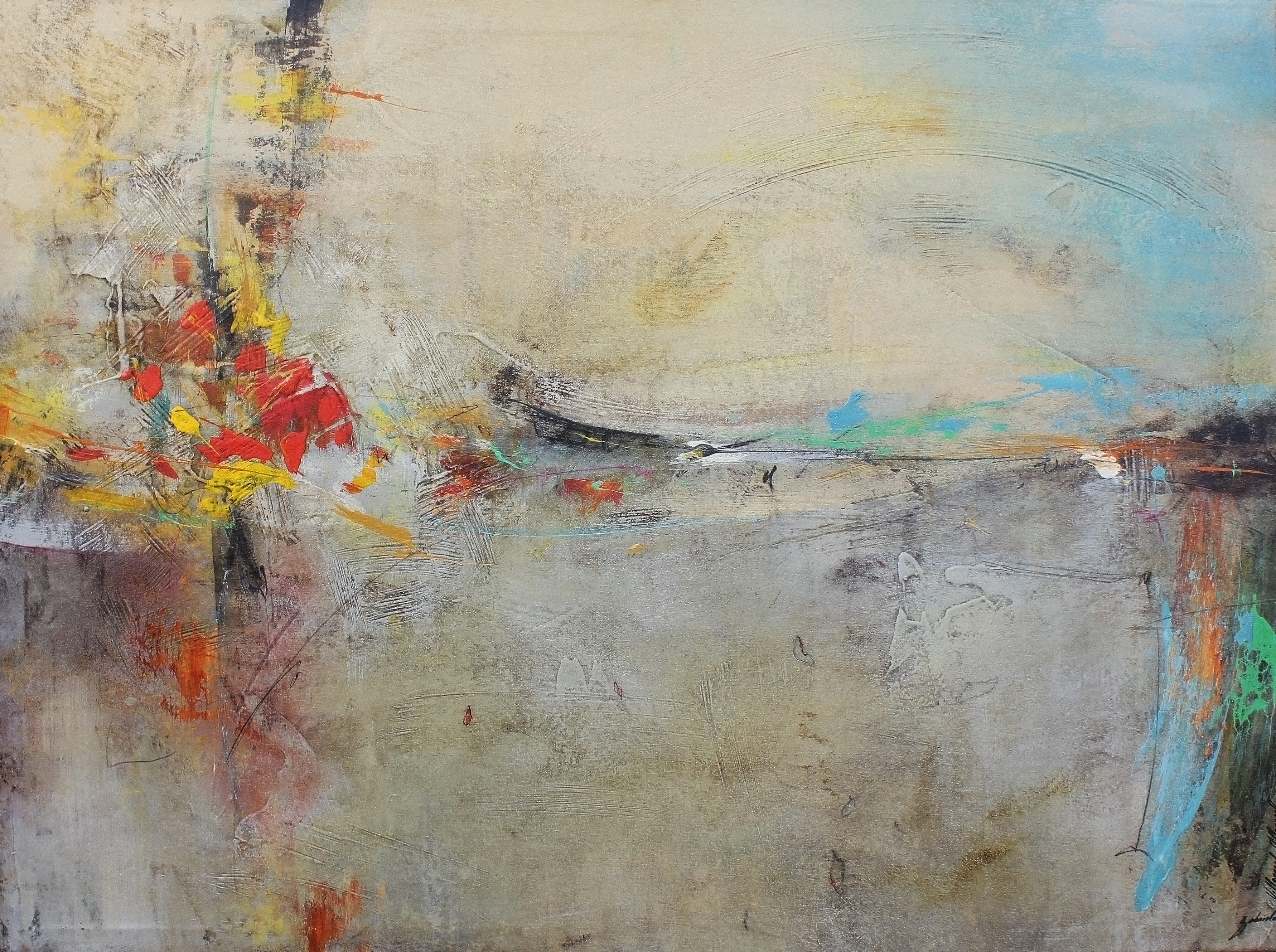 With delicate shades of beige and grey, enhanced by flashes of red and yellow, this canvas reveals a refined balance between matter and color. The soft glazes and incisive markings suggest an abstract landscape, both poetic and contemplative.