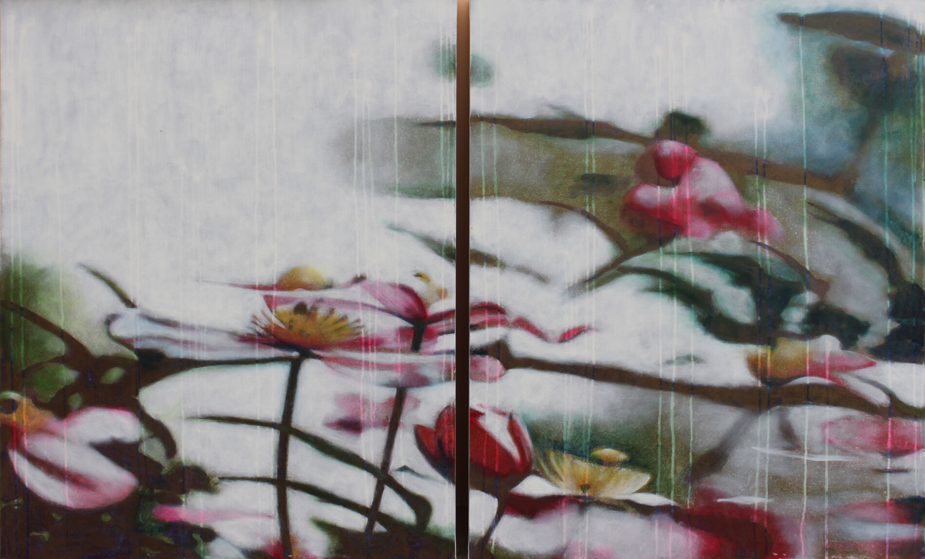 Aria Tropicale (Tropical Air), a charming diptych by Massimo Barlettani, offers an enchanting and harmonious vision of nature. The two panels, joined together in a single composition, depict a flower-filled meadow, where pretty pink flowers spread delicately under a clear sky. This work invites the viewer to immerse themselves in the beauty and fragility of nature, transforming the observation of a simple meadow into an evocative and serene visual experience.