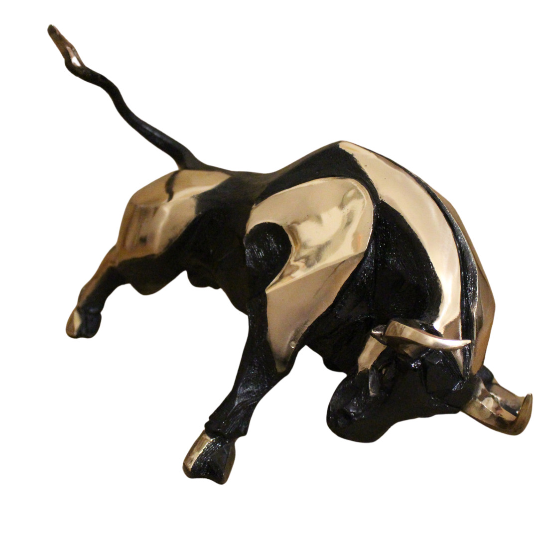 The bull is depicted in a compact yet dynamic pose, as if ready to spring into action. The solid forms and the contrast between deep black and golden accents accentuate the work’s inner tension, whilst the clean lines reinforce its sculptural presence. A sculpture that conveys strength, control and intensity through a contemporary and minimalist aesthetic.