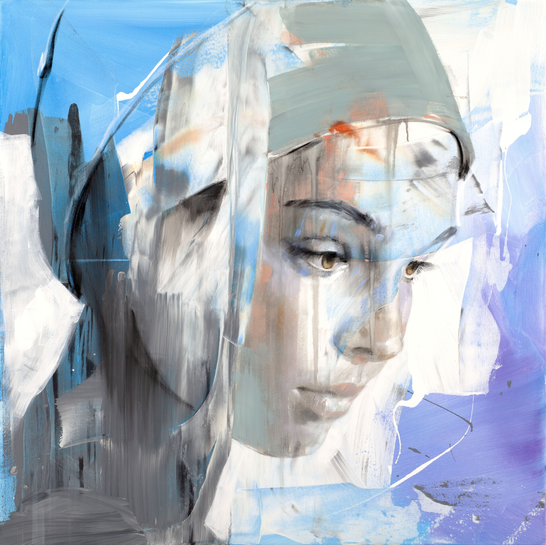 The cool tones, dominated by blues, greys and violets, are crossed by light glazes and more decisive contrasts, creating a dynamic and vibrant surface. The gaze, collected and introspective, guides the composition and gives the work a strong emotional tension, making it a significant example of the artist's research between figure and abstraction.