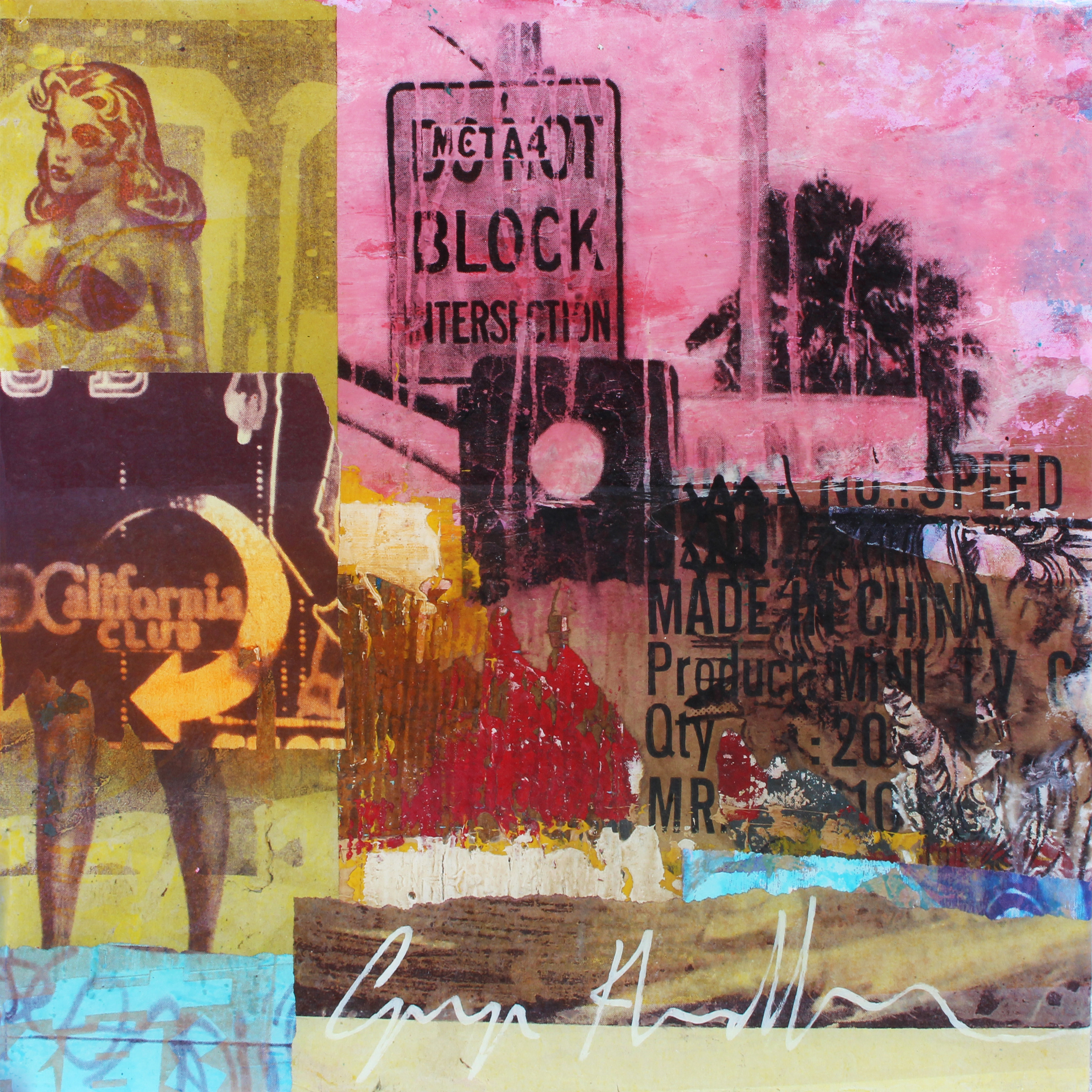 In this work from the Road Trip series, the artist combines vivid tones and fragmented imagery emerging beneath transparent layers of color. The mixed technique with epoxy creates a suspended, three-dimensional effect, as if each visual element were floating in an imaginary space.
