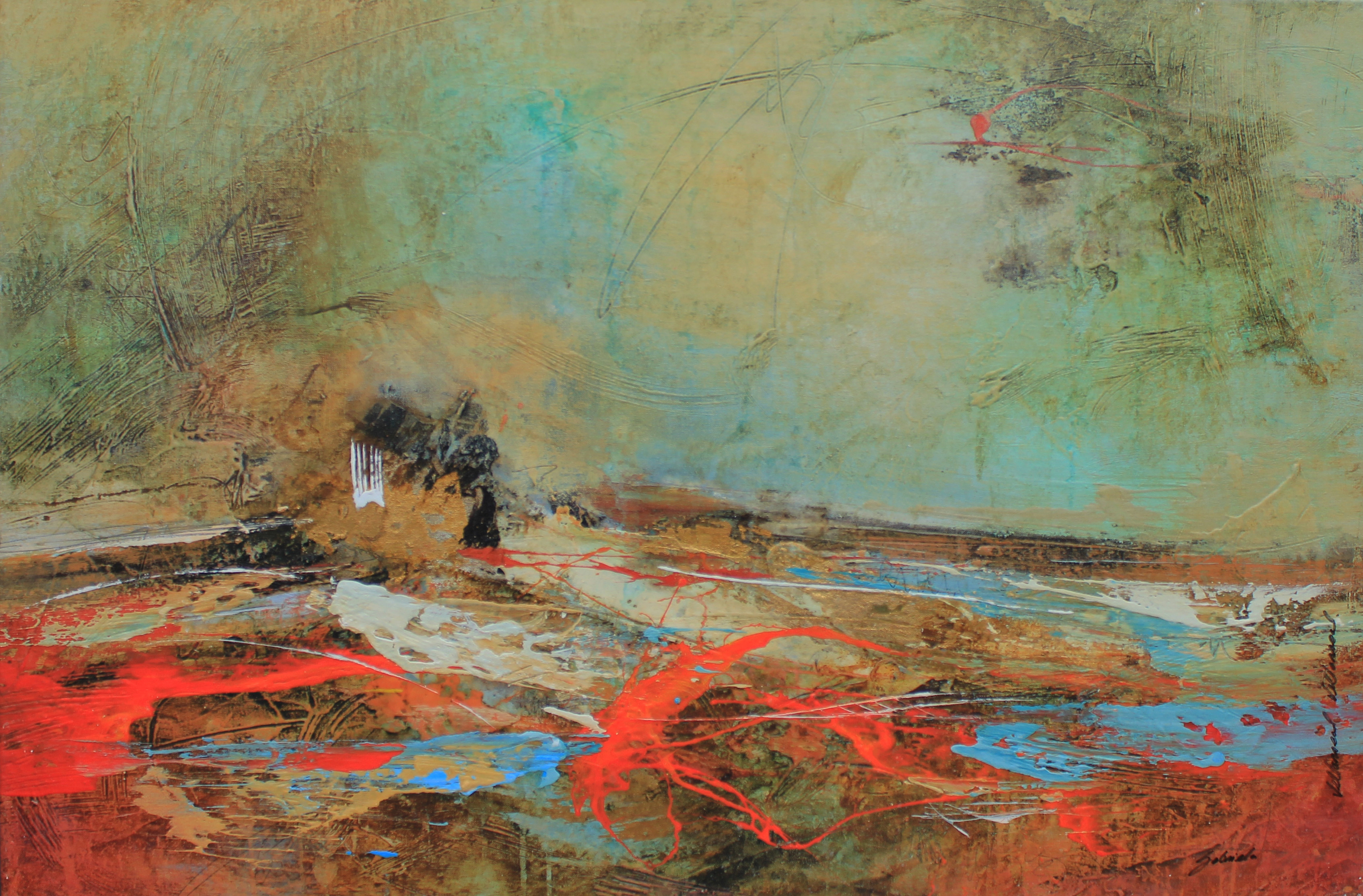 With a masterful use of transparencies and layering, Gabriela Villareal creates an intense work where the strength of reds and oranges contrasts with more subdued earthy tones. The result is a vibrant canvas, uniting energy and harmony.