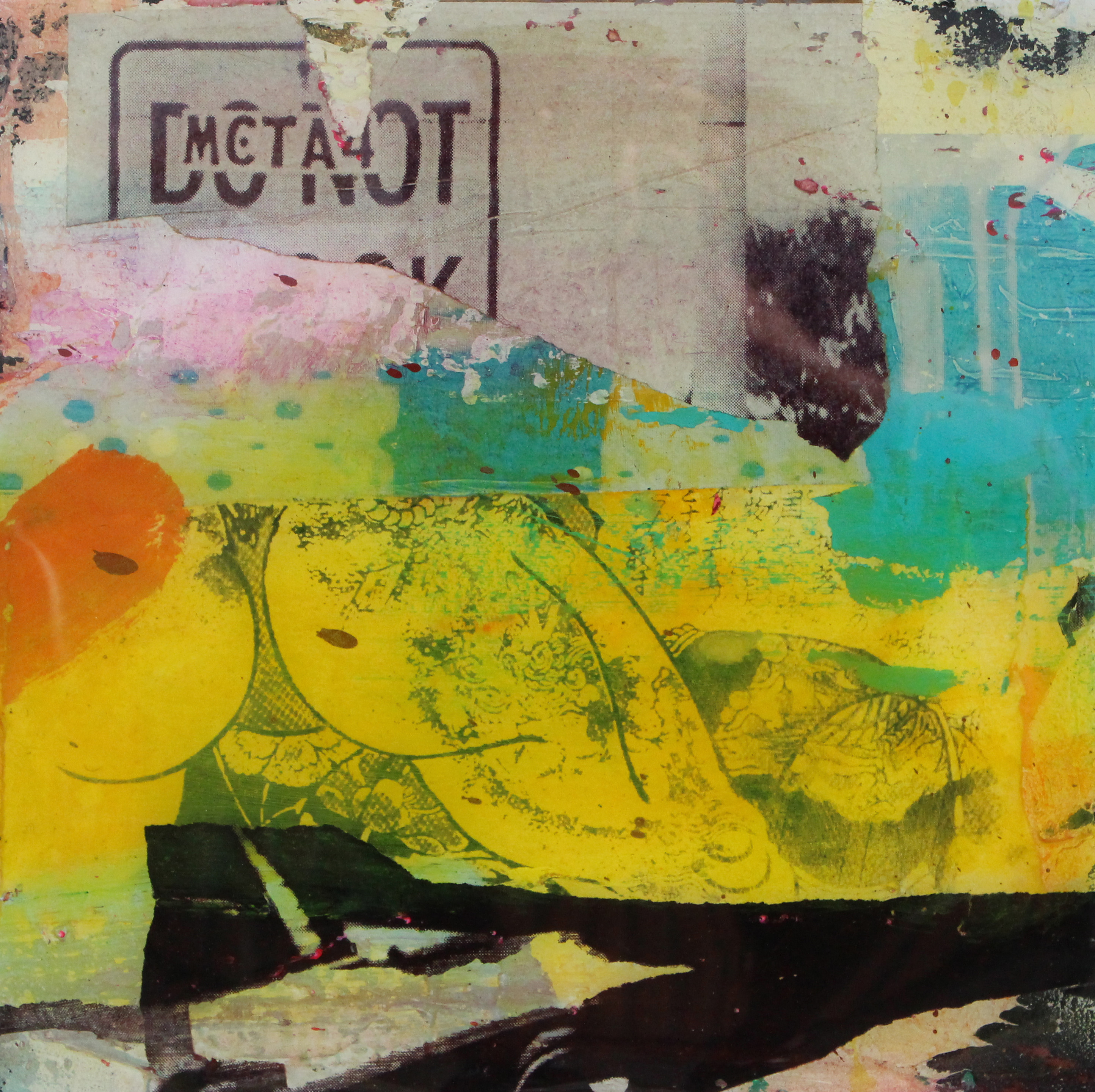 In this small square format from the Road Trip (2016) series, Heidweiller condenses his creative energy into a compact composition. Bold colors, graphic signs, and layered collage interact with one another, generating immediate visual impact. The epoxy adds brilliance and a suspended effect that enhances depth.