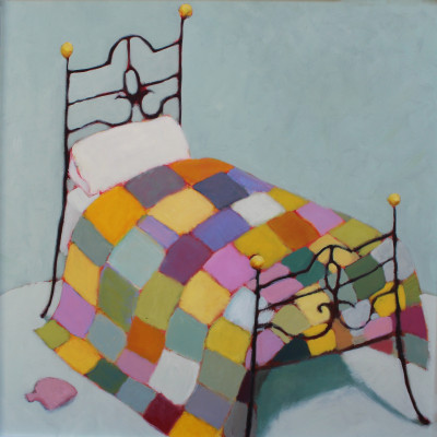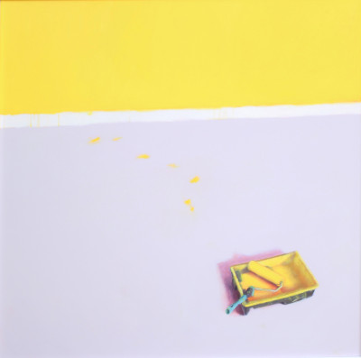 In this large painting by Beth Richardson, a symphony of shapes and colours delights the viewer's eye. In the foreground is the pair of yellow chairs - the artist's signature - in front of three rows of colourful cloths hung out to dry. A scene of everyday beauty against a uniform sky-blue background.