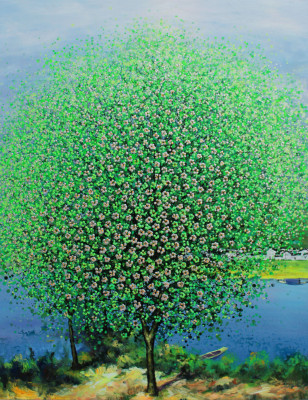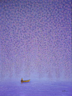 In this evocative composition, part of Je Shen’s latest body of work, two lovers walk together, immersed in a magnificent garden filled with countless shades of pink.