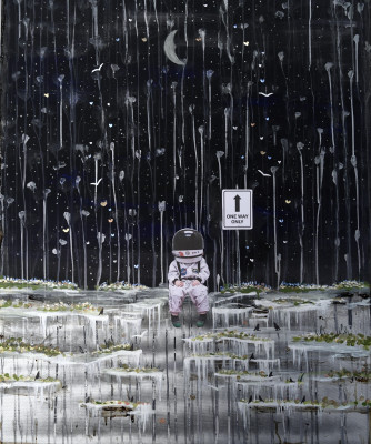 Un piccolo astronauta, sospeso tra sogno e realtà, siede in un paesaggio notturno carico di poesia e mistero. La luna, la pioggia e i dettagli luminosi creano un’atmosfera onirica che parla di crescita, scelta e desiderio di esplorazione.