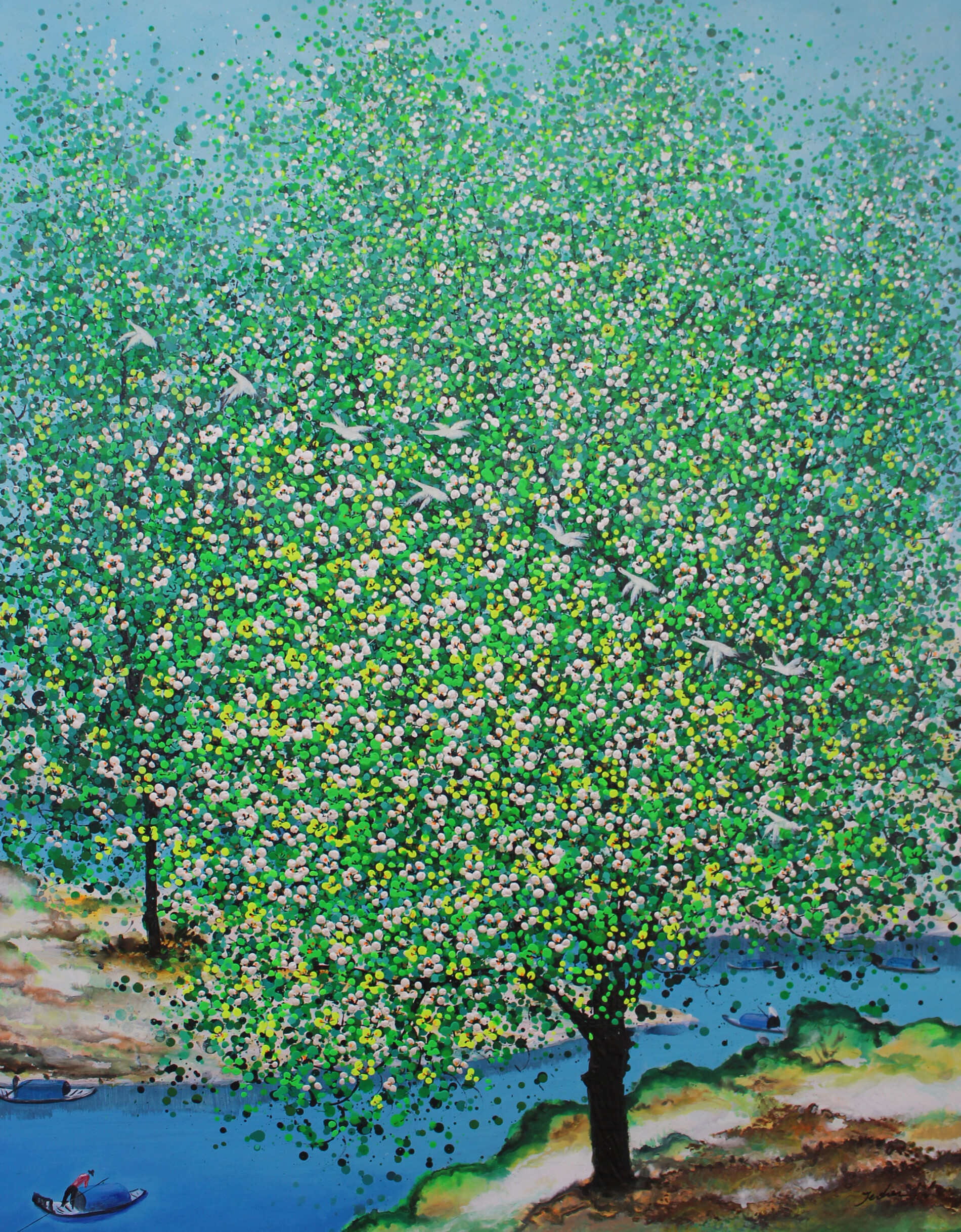 In quest’opera Je Shen rappresenta un paesaggio sospeso e immersivo, dominato da un imponente albero in fiore che si apre su acque calme e luminose.