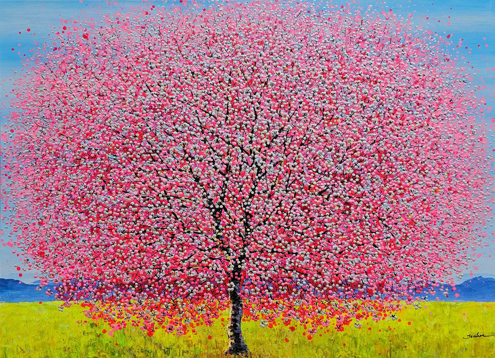 Nel dipinto “Meditation 665” di Je Shen, l’albero di ciliegio diventa protagonista assoluto, un’esplosione di colore e vitalità che riempie l’intera scena come un inno alla bellezza della natura. La sua chioma, composta da migliaia di piccoli tocchi cromatici, vibra in una tavolozza intensa di rossi, rosa, aranci e verdi, creando un effetto visivo luminoso e quasi pulsante. Ancora una volta, Je Shen riesce a fondere poesia e colore, trasformando un soggetto naturale in un’immagine che invita lo spettatore a soffermarsi, respirare e lasciarsi avvolgere dalla forza emotiva dell’opera.