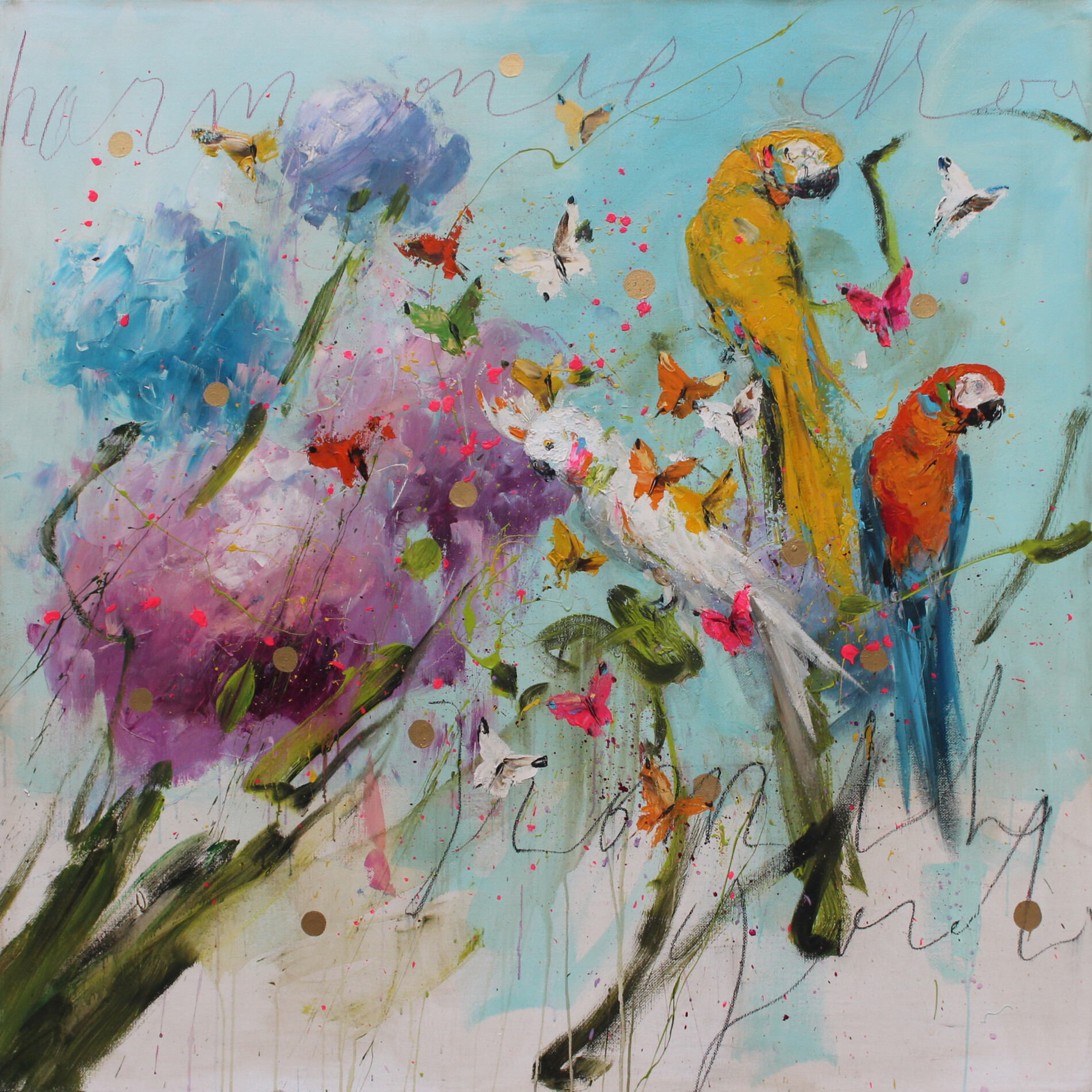 In quest’opera di grandi dimensioni, Luca Bellandi costruisce un mondo che sembra respirare luce. I colori si dissolvono l’uno nell’altro come in un sogno tropicale, dove i pappagalli diventano sentinelle di un giardino in continua fioritura. Le farfalle, rapide e leggere, attraversano la scena come pensieri che si accendono all’improvviso, mentre le pennellate morbide e liquide modellano un’atmosfera di dolce anarchia naturale.