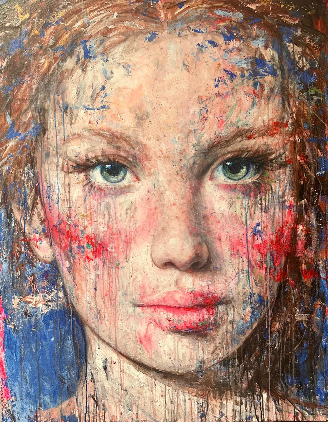 La figura non è descrittiva, ma rivelata: la materia pittorica viene lavorata, rimossa e lasciata colare fino a far affiorare uno sguardo intenso e sospeso, sintesi della sua ricerca tra figurazione e visione.