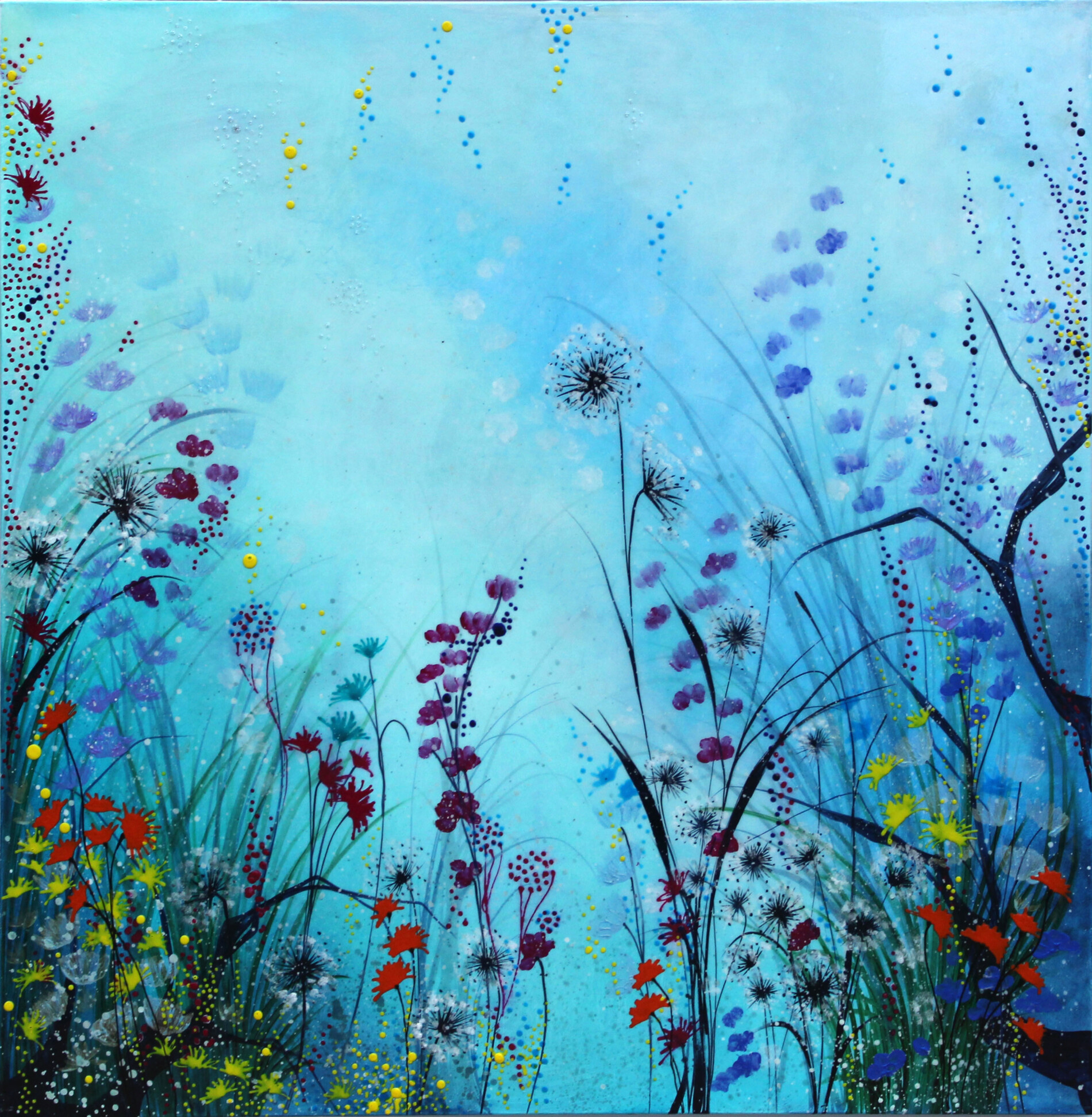Un giardino sospeso nella luce, dove il cielo si dissolve in mille sfumature d’azzurro e i fiori sembrano nascere direttamente dall’aria. In questa opera, Sara Paini intreccia colore, gesto e resina per creare un paesaggio emotivo più che reale: un luogo che vibra, che respira, che accoglie.