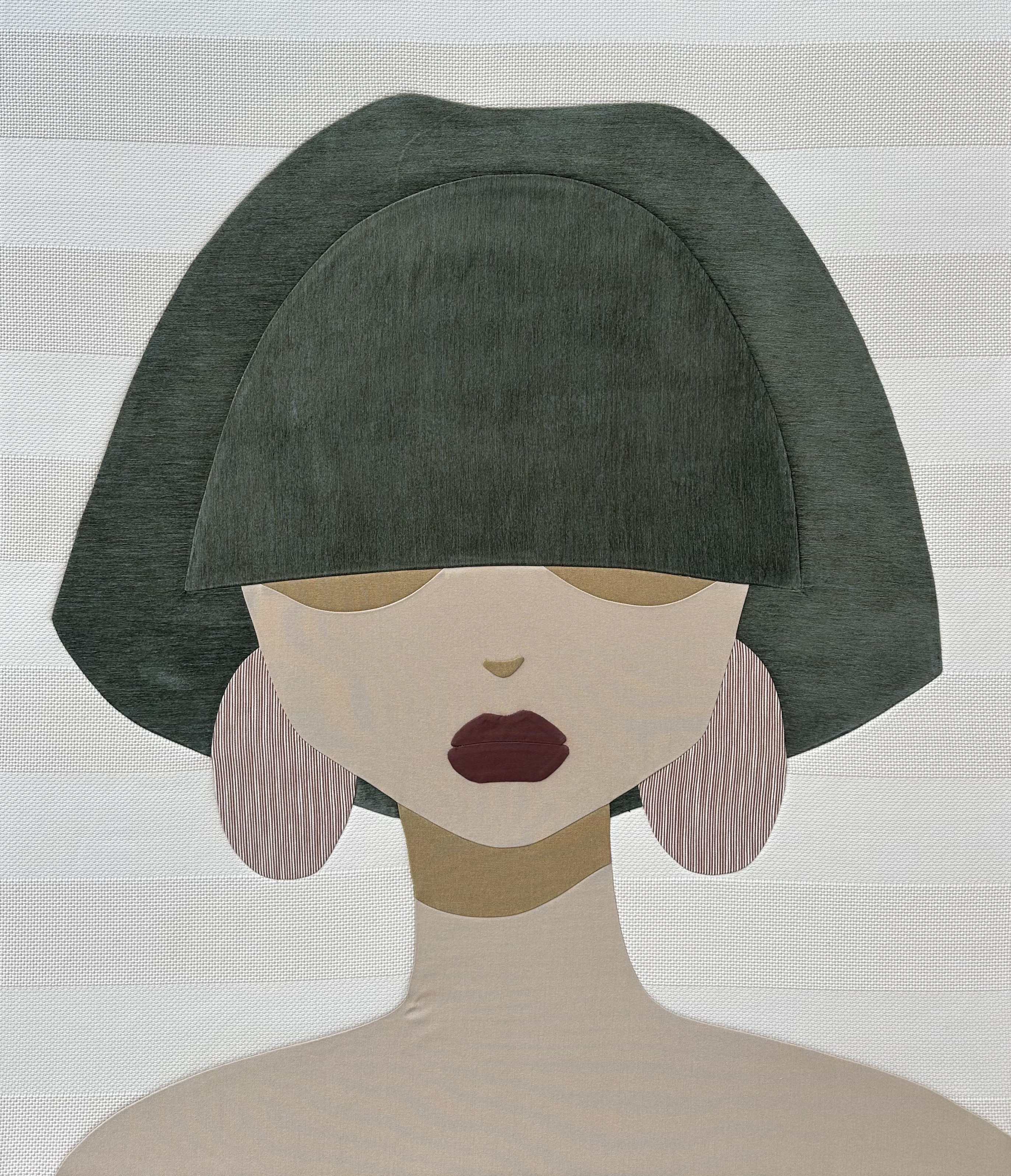 In quest’opera di grandi dimensioni Alessandra Perini costruisce un ritratto essenziale in cui la figura prende forma attraverso l’assemblaggio di tessuti e cuciture. La cucitura diventa segno grafico e struttura, mentre i tessuti - selezionati per grana e resa luminosa - modellano l’immagine come farebbe il colore in pittura. Qui la matrice sartoriale dell’artista è evidente: il tessuto non è semplice supporto ma sostanza narrativa, capace di tradurre sensibilità e identità in forma visiva.