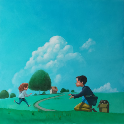 In questo olio su tela, Diego Santini racconta un gioco che diventa promessa: un attimo di complicità tra due bambini che osservano insieme qualcosa da non lasciar sfuggire. I loro gesti si accordano con naturalezza, immersi in un’atmosfera lieve e sognante. Con il suo stile evocativo, Santini trasforma una scena fantasiosa in una piccola metafora dell’imparare a tenere vicino ciò che conta davvero.