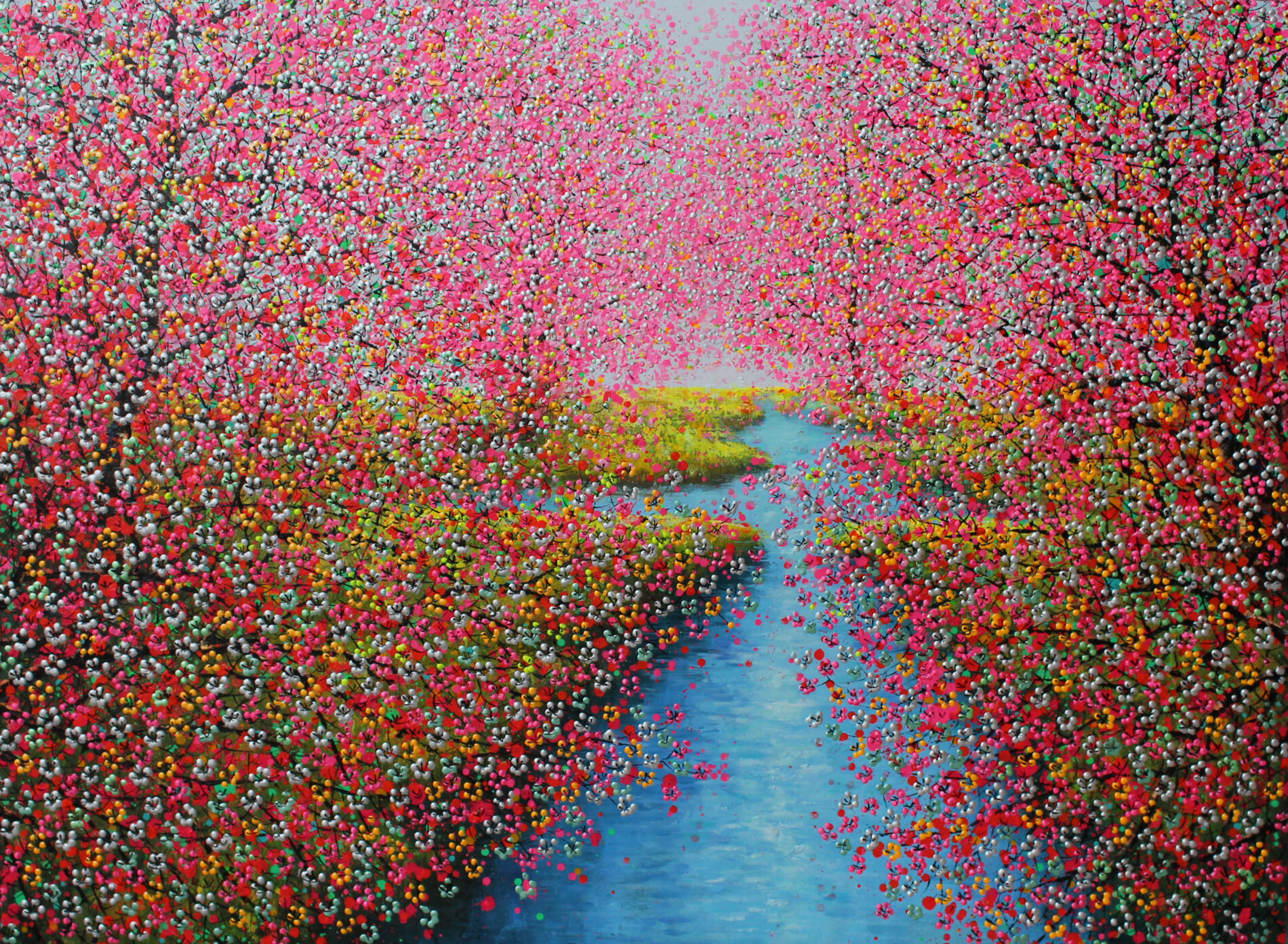 In questa luminosa composizione, Je Shen conduce lo spettatore in un sentiero di pura meraviglia visiva: un corso d’acqua azzurro attraversa un tripudio di fiori multicolori, creando un paesaggio quasi sospeso tra realtà e sogno. La ricchezza cromatica e la minuziosità del tratto trasformano la scena in un inno alla vitalità della natura, esaltando lo stile inconfondibile di Je Shen e la sua capacità di evocare emozioni attraverso la luce e il colore.