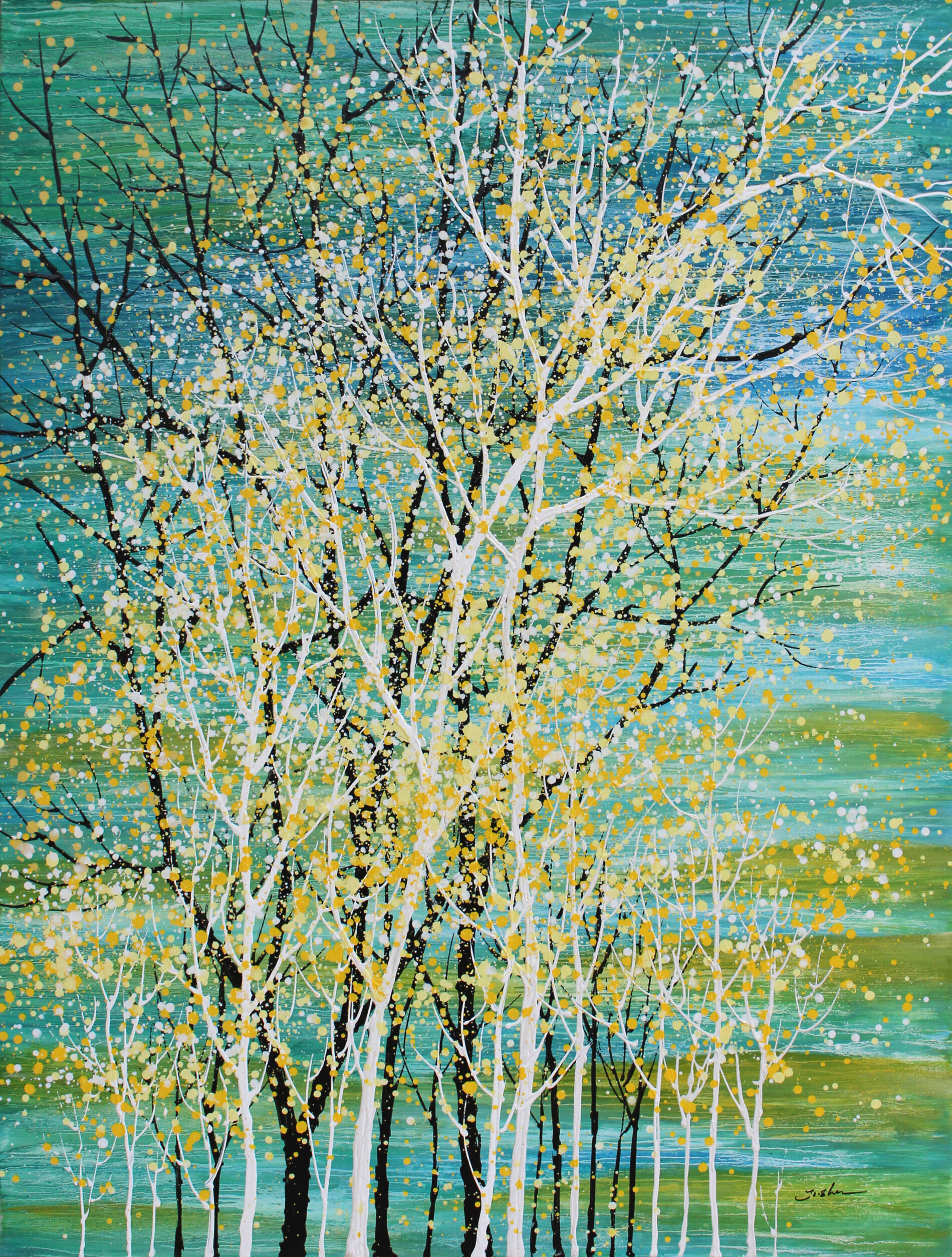 Nel dipinto “Meditation 866” di Je Shen, un gruppo di alberi sottili si staglia su un paesaggio ricco di sfumature verdi e turchesi. I tronchi chiari, quasi luminosi, creano un contrasto elegante con i rami scuri sullo sfondo, mentre una pioggia di punti gialli e bianchi suggerisce movimento, luce e vitalità. L’opera trasmette una sensazione di freschezza e armonia naturale, grazie al ritmo visivo delle linee verticali e alla profondità delle tonalità sovrapposte. Con questo lavoro, Je Shen continua a esplorare il tema della meditazione attraverso colore, equilibrio e una grande capacità di creare atmosfere senza tempo.