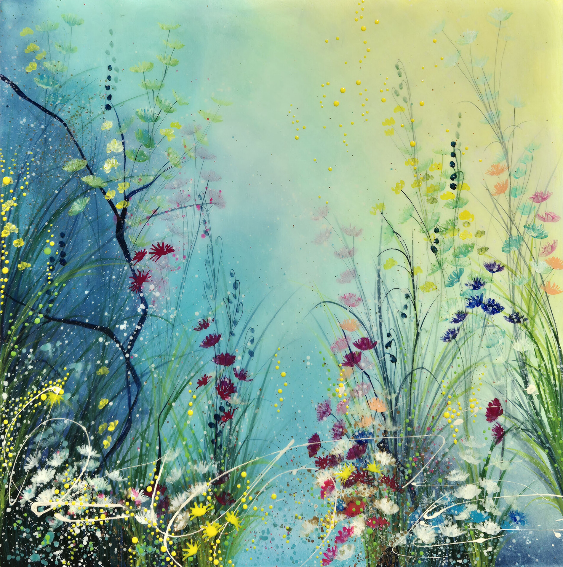 Un giardino che sboccia “In mezzo al cielo”, dove i colori si dissolvono nella luce e l’aria sembra farsi acqua, respiro, stupore. In quest’opera, Sara Paini intreccia toni pastello, trasparenze e vibrazioni materiche per creare un creare un’atmosfera vibrante, fatta di sensazioni prima ancora che di forme.