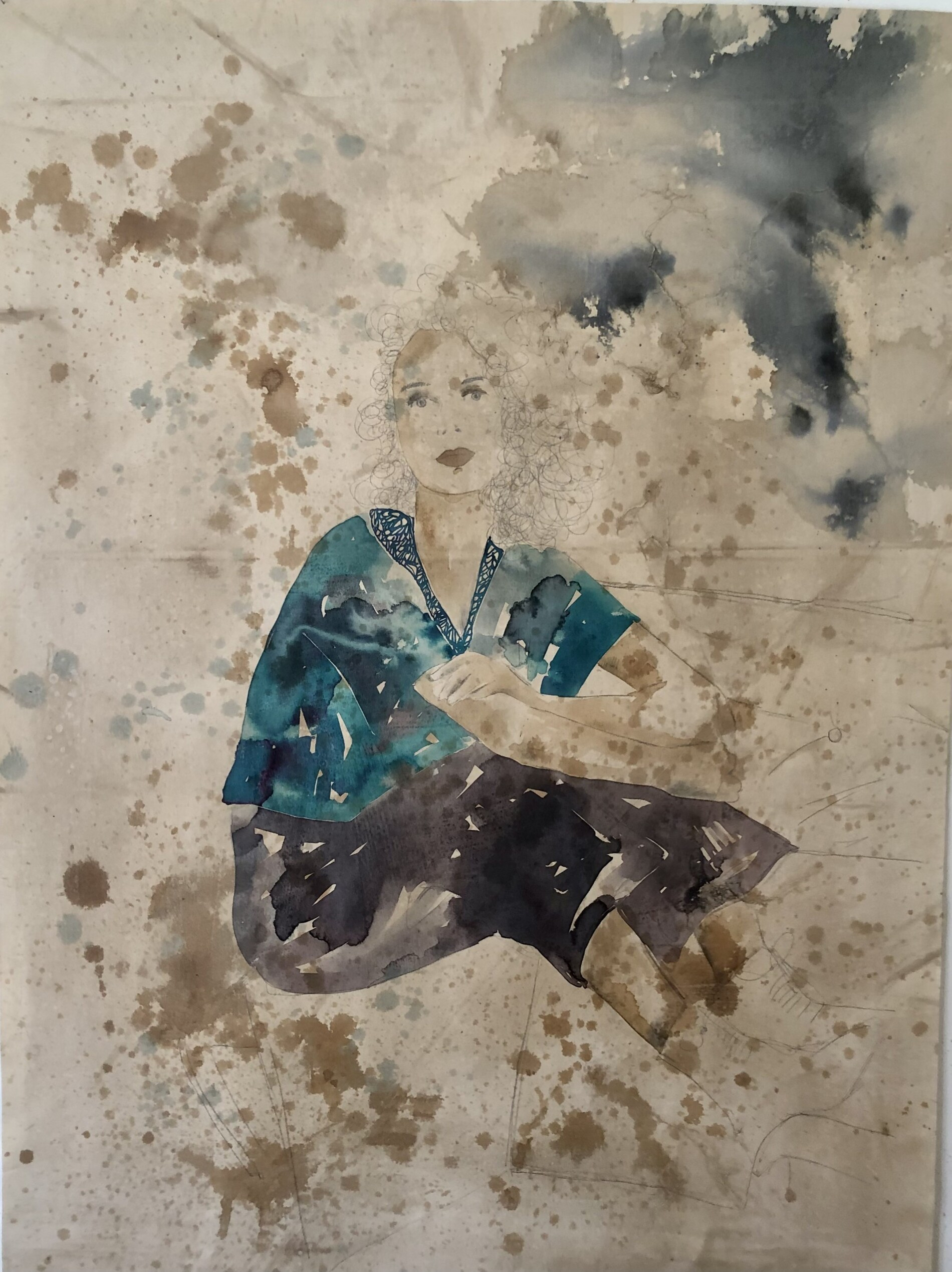 In quest’opera su tela di grandi dimensioni una figura femminile è immersa in un campo cromatico fatto di spruzzi, velature e stratificazioni fluide, elementi distintivi della tecnica di Valeria Patrizi. I blu profondi si intrecciano ai toni più caldi della terra, creando un dialogo armonioso tra corpo e atmosfera.