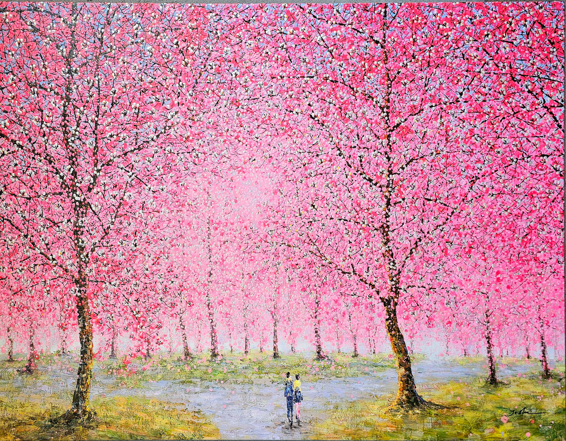 In questo incantevole dipinto, Je Shen conduce lo spettatore in un viale di delicate fioriture rosa, dove la luce filtra tra gli alberi creando un’atmosfera di quiete e poesia. Al centro della scena, una coppia cammina immersa in questo paesaggio sospeso, simbolo di armonia e contemplazione. Con la sua caratteristica trama pittorica e l’uso avvolgente del colore, Je Shen trasforma la natura in un luogo dell’anima, capace di evocare emozioni profonde.