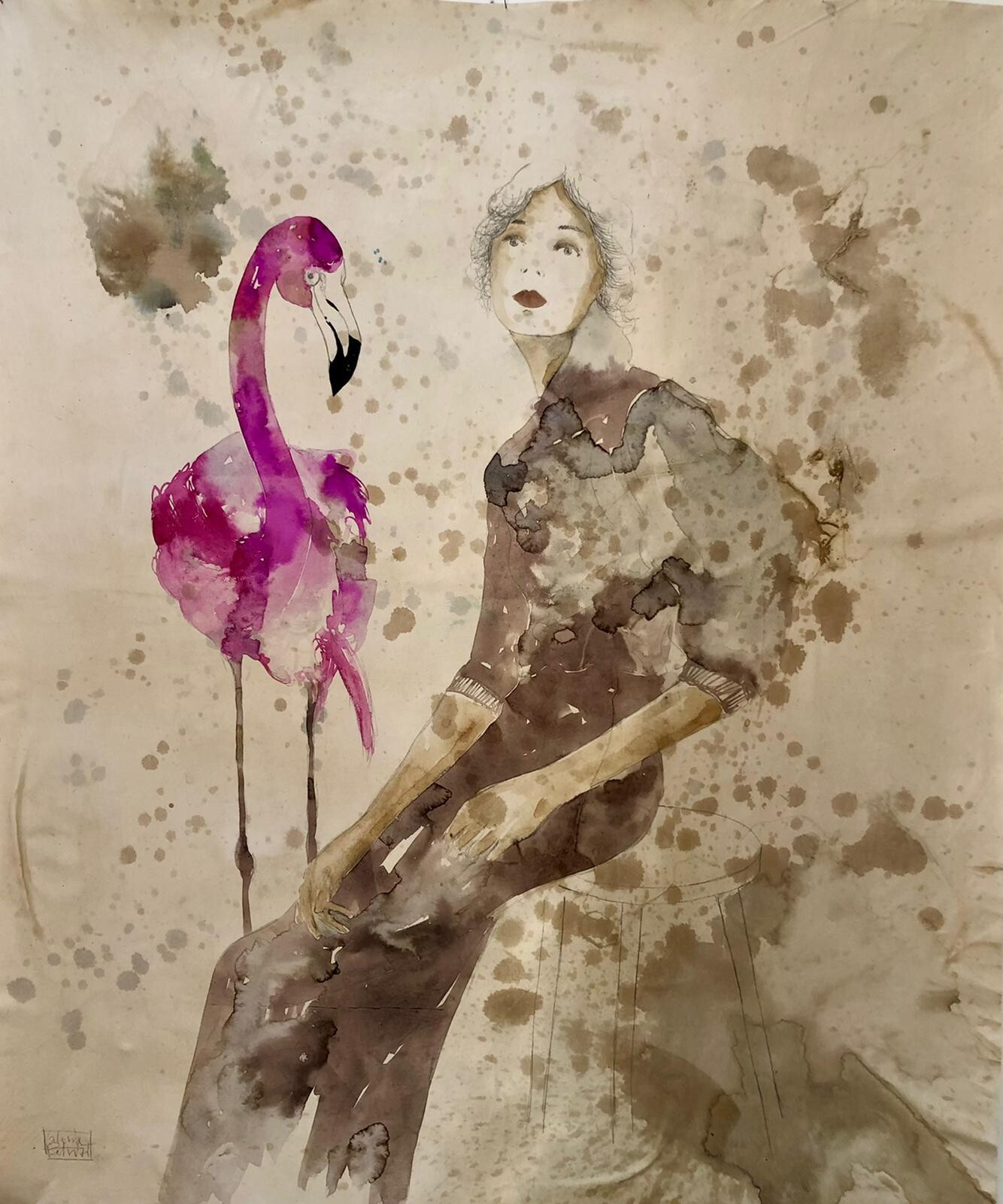 In “The day of the flamingo” Valeria Patrizi ci regala un’immagine surreale e delicata, in cui il mondo animale e quello umano si incontrano in perfetto equilibrio. La figura femminile, con il suo sguardo sognante, è affiancata da un fenicottero rosa vibrante che introduce una nota di ironia e leggerezza alla scena.