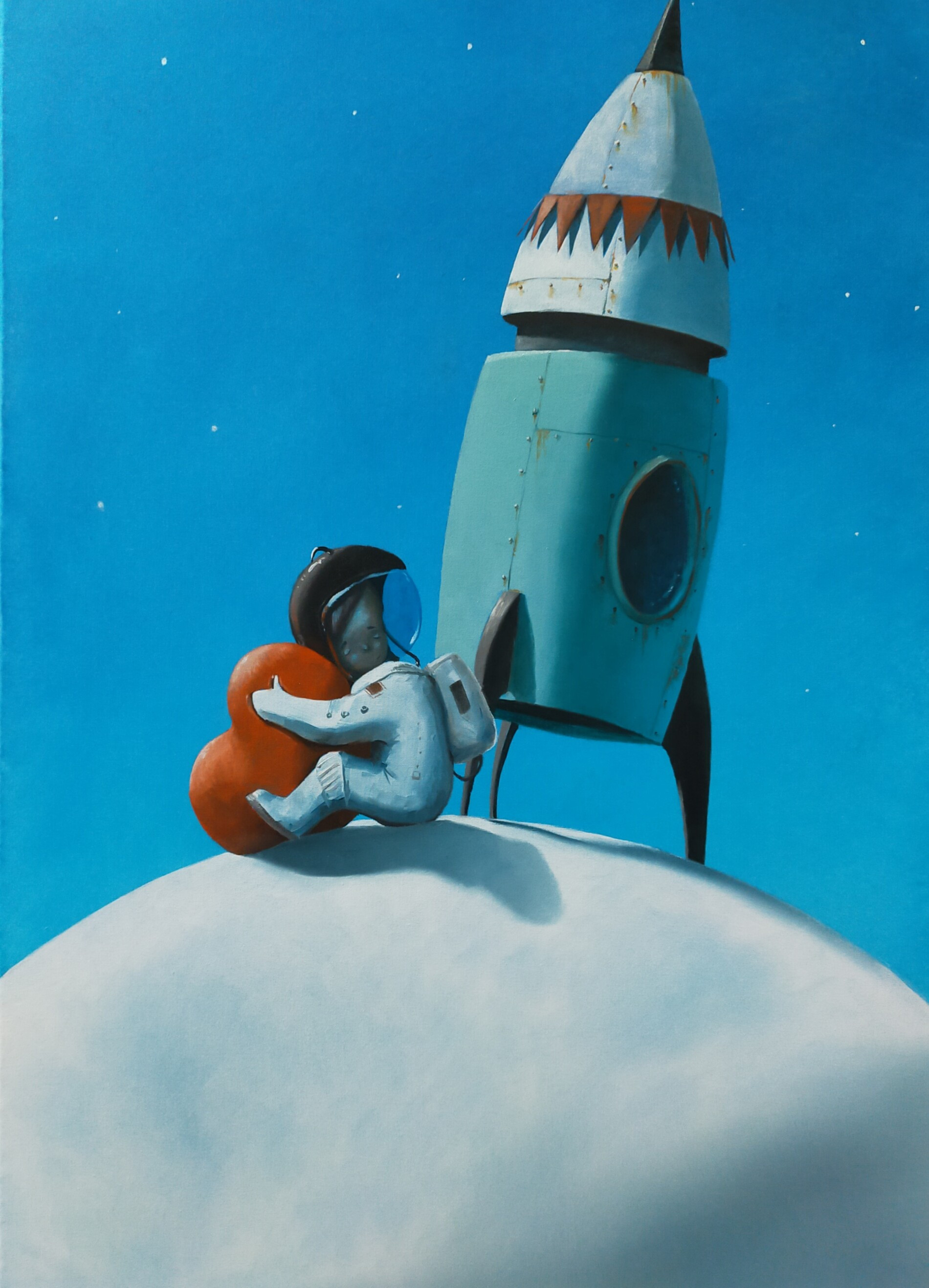 Su una luna silenziosa, un piccolo astronauta siede abbracciato a un grande cuore rosso, custodendolo come il più prezioso dei compagni di viaggio. Quel cuore diventa simbolo delle emozioni che lo accompagnano ovunque, del calore familiare che non abbandona mai, nemmeno tra le stelle.