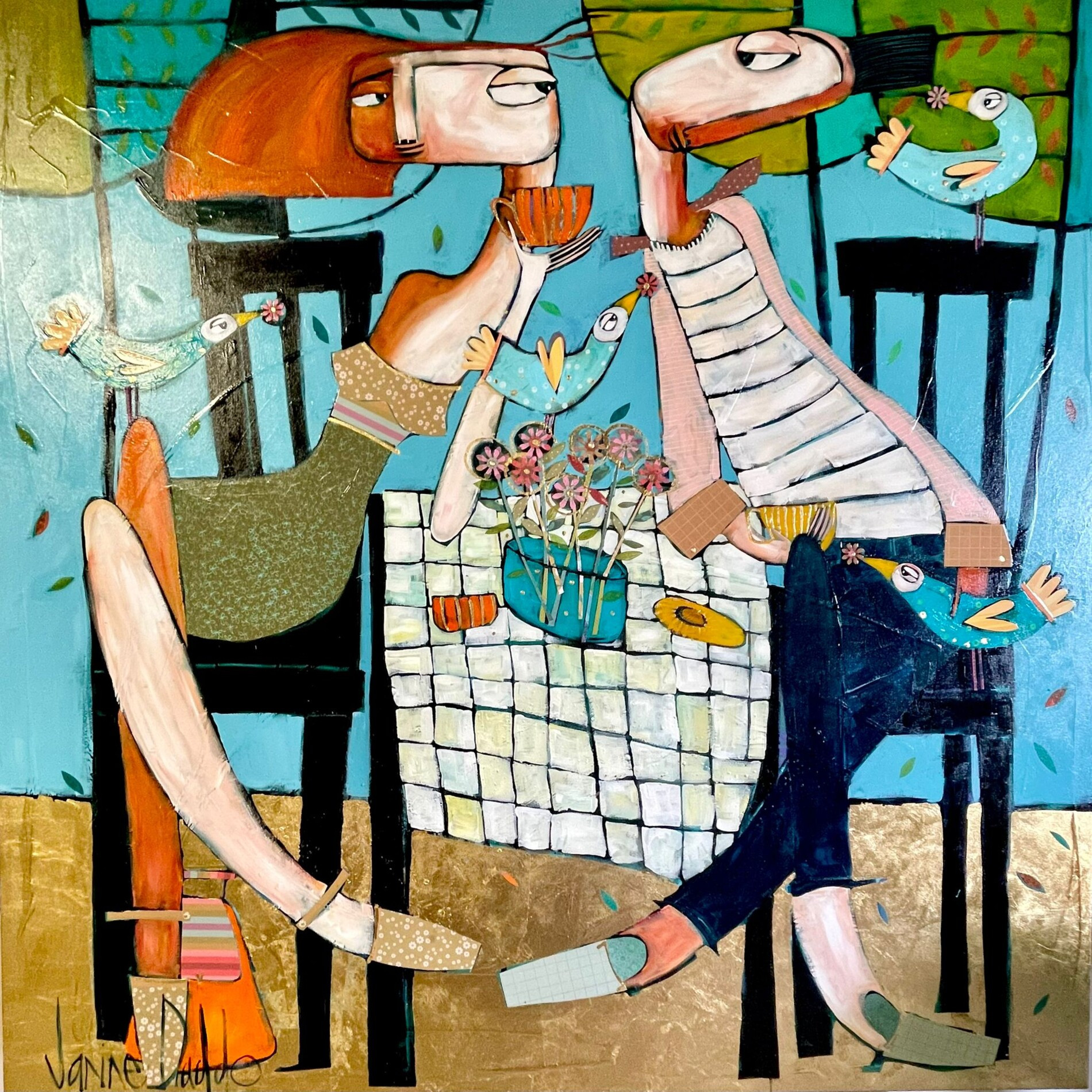 In quest’opera di grandi dimensioni due innamorati siedono uno di fronte all’altra, immersi in una conversazione intima e senza tempo accompagnati da piccoli gesti e oggetti quotidiani che costruiscono uno spazio di complicità. L’opera racconta con leggerezza e poesia la bellezza dello stare insieme, di quel dialogo continuo che unisce e fa sentire a casa.