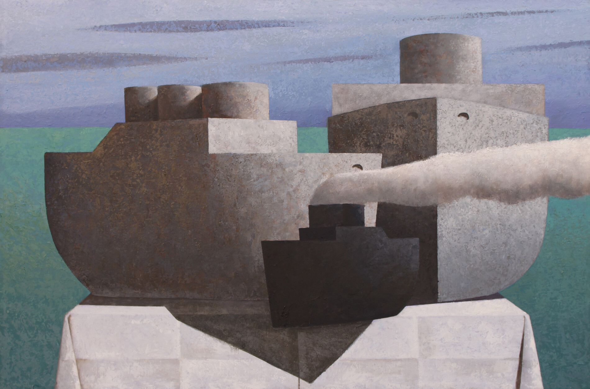 In quest’opera di Matthias Brandes, appartenente alla sua produzione più recente, la forma di un ferro da stiro fumante si trasfigura in una presenza monumentale, evocando la sagoma di una nave che solca impetuosa i mari. La composizione, costruita attraverso volumi solidi e superfici materiche, accentua questa ambiguità percettiva, cifra distintiva della ricerca dell’artista.