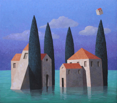 Un edificio emerge dall’acqua calma, illuminato da una luce che ne ammorbidisce i contorni e ne rivela la calma interiore. Attorno a lui, piccole case sospese attraversano il cielo come pensieri leggeri, aprendo la scena a una dimensione immaginativa e serena. Brandes crea così un luogo di silenziosa armonia, dove l’immobilità diventa possibilità e il paesaggio si trasforma in un invito alla quiete e alla contemplazione.