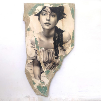 In Being and Time, Toni Alfano cattura la forza ancestrale di un’icona senza tempo. Lo sguardo ipnotico di una donna nativa americana, vestita con abiti tradizionali, attraversa la superficie consunta dell’opera, evocando un legame profondo tra passato e presente. La tecnica del carboncino, intensa e vibrante, scolpisce il volto con una profondità quasi scultorea, mentre il descialbo rivela strati di materia e memoria, come se l’immagine fosse riemersa da un muro antico. L’opera diventa così un dialogo tra essere e divenire, tra identità e trascendenza, tra la storia e lo sguardo di chi osserva.