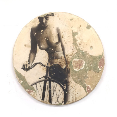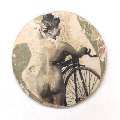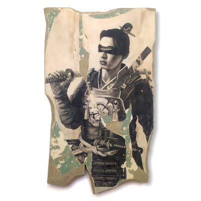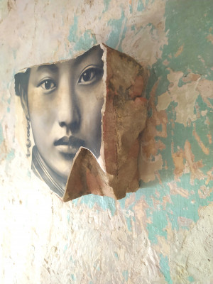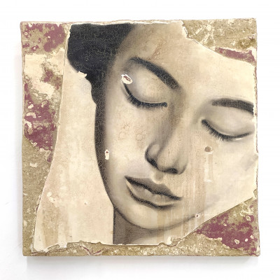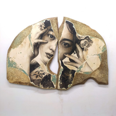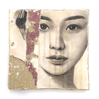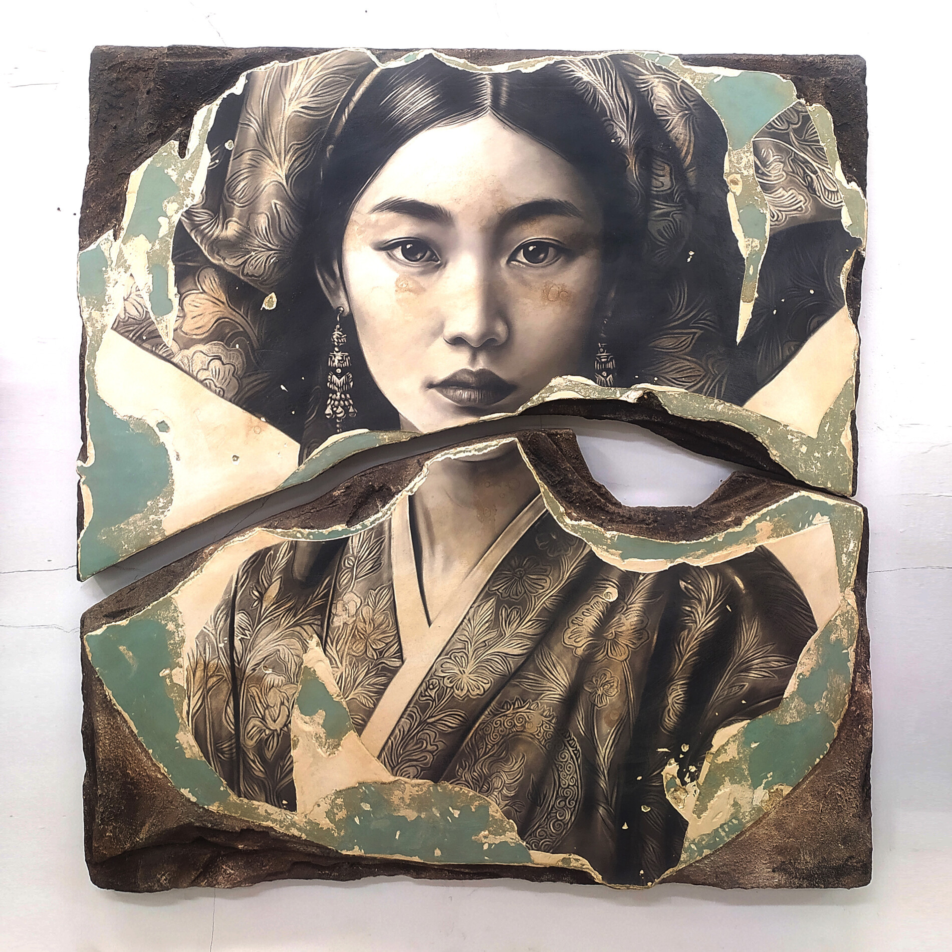 In quest’opera, Toni Alfano cattura la forza ancestrale di un’icona senza tempo. Lo sguardo ipnotico della figura femminile, avvolta in abiti che richiamano un immaginario orientale, attraversa la superficie consunta del supporto, evocando un legame profondo tra passato e presente. La tecnica del carboncino, intensa e vibrante, scolpisce il volto con una profondità quasi scultorea, mentre il descialbo rivela strati di materia e memoria, come se l’immagine fosse riemersa da un muro antico. L’opera diventa così un dialogo tra essere e divenire, tra identità e trascendenza, tra la storia e lo sguardo di chi osserva.