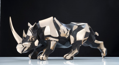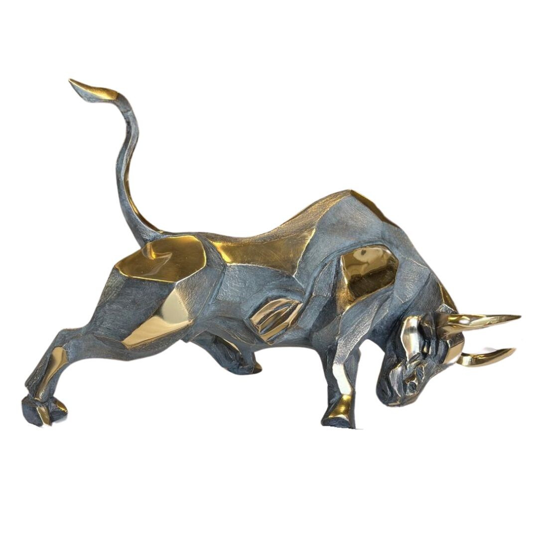 Il toro di Sabrina Ferrari è colto nell’istante della carica, con una tensione dinamica che attraversa l’intera struttura. Le superfici sfaccettate e i contrasti tra patina chiara e inserti dorati amplificano il senso di movimento e potenza. Un’opera che unisce energia primitiva e rigore formale, trasformando la forza animale in un segno contemporaneo ed elegante.