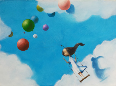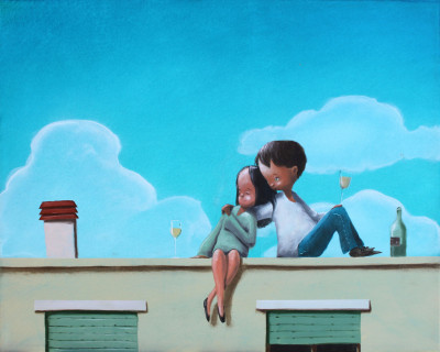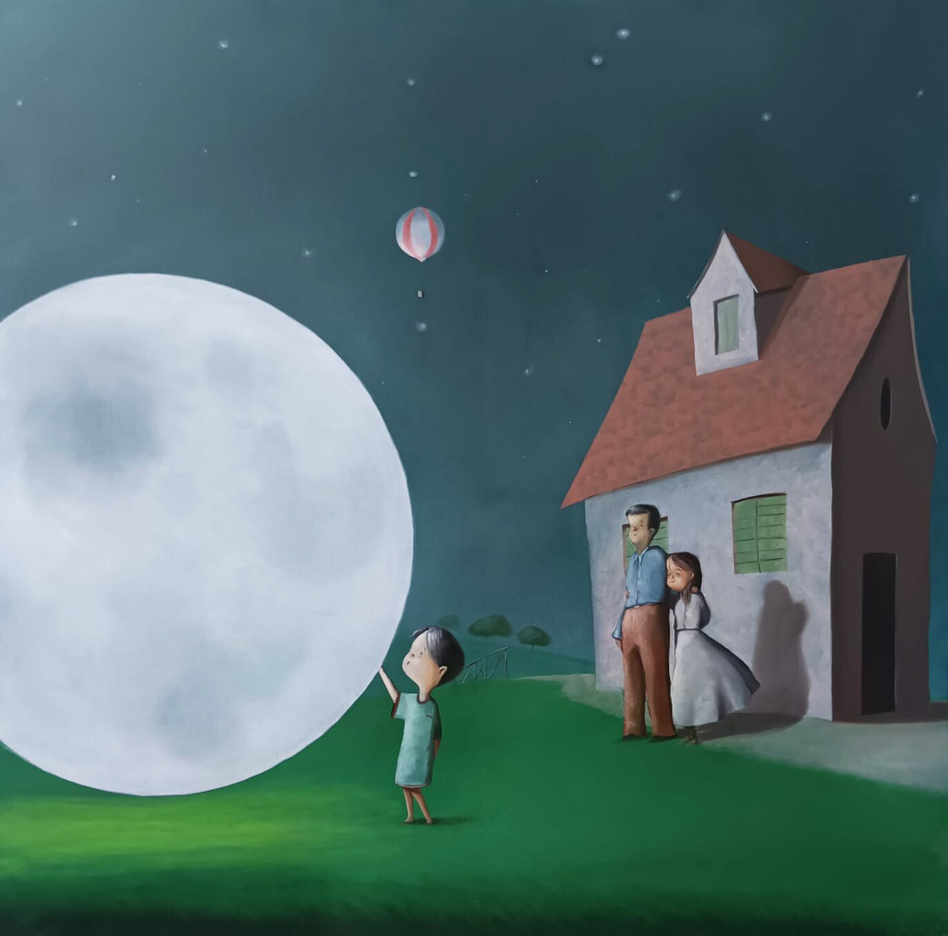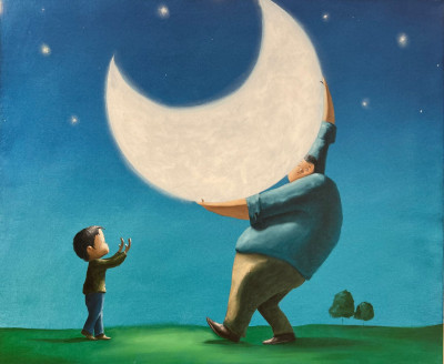 Sotto un cielo notturno punteggiato di stelle, un bambino sfiora una luna posata sul prato come fosse un dono caduto dal cielo. Poco distanti, i suoi genitori osservano la scena dall’ingresso della loro casa, immersi in quella quiete sospesa che Diego Santini restituisce con le sue morbide velature a olio. L’immagine suggerisce l’incanto dei piccoli gesti: la meraviglia di chi osa avvicinarsi ai sogni e la tenerezza di chi li custodisce da lontano, in un equilibrio delicato che sfuma naturalmente nel magico.