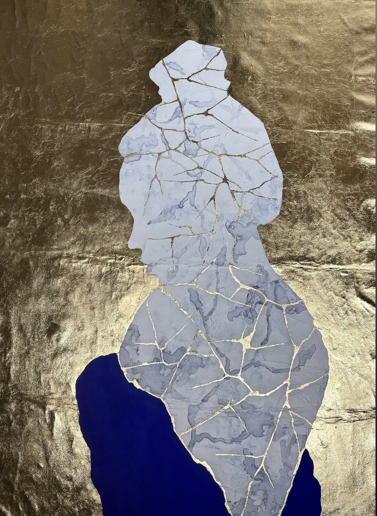 In questa Présence, Ramona Russu dà forma a una figura che sembra scolpita nella luce. La silhouette, composta da frammenti in delicate tonalità grigio-azzurre, è attraversata da filamenti dorati che ricuciono la materia come una mappa intima. Sullo sfondo, la foglia d’oro diffonde un bagliore quasi sacro, mentre il blu profondo alla base radica la figura in un equilibrio sottile tra fragilità e splendore.