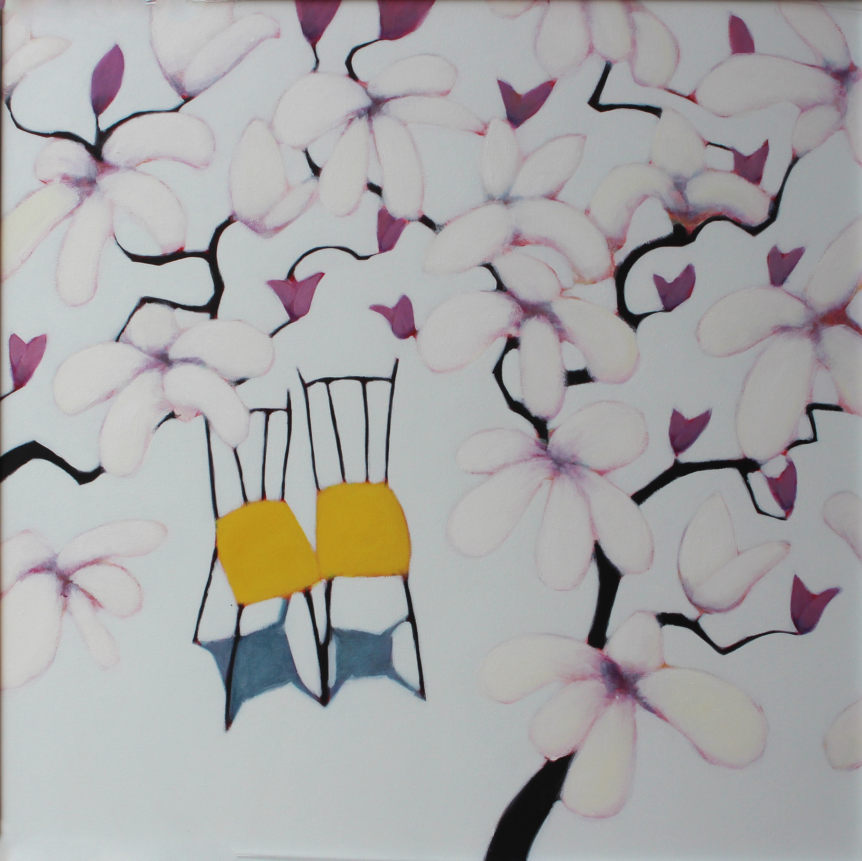 Tra i soggetti preferiti della produzione di Beth Richardson ci sono oggetti ordinari e quotidiani, delle quali l'artista britannica esplora le caratteristiche umane attraverso una composizione pittorica molto particolare e l'uso di campiture di colore piatte e solide. In questa opera di grande fomato lo spettatore può ammirare, da una prospettiva quasi "aerea" due seggioline giallo acceso - rappresentazione di una coppia - sotto uno splendido albero di magnolia. Una scena di grande eleganza e poesia.