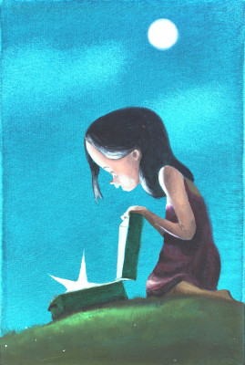 Su una riva silenziosa, una bambina siede in equilibrio sulla schiena di una grande balena emersa dall’acqua, mentre un bambino la attende con le braccia aperte, pronto ad accoglierla. La luna illumina la scena con una luce morbida, rendendo il momento ancora più intimo e rassicurante. L’incontro diventa così un delicato gesto di fiducia: la promessa che, a volte, basta qualcuno che ti aspetta per non temere più nulla.