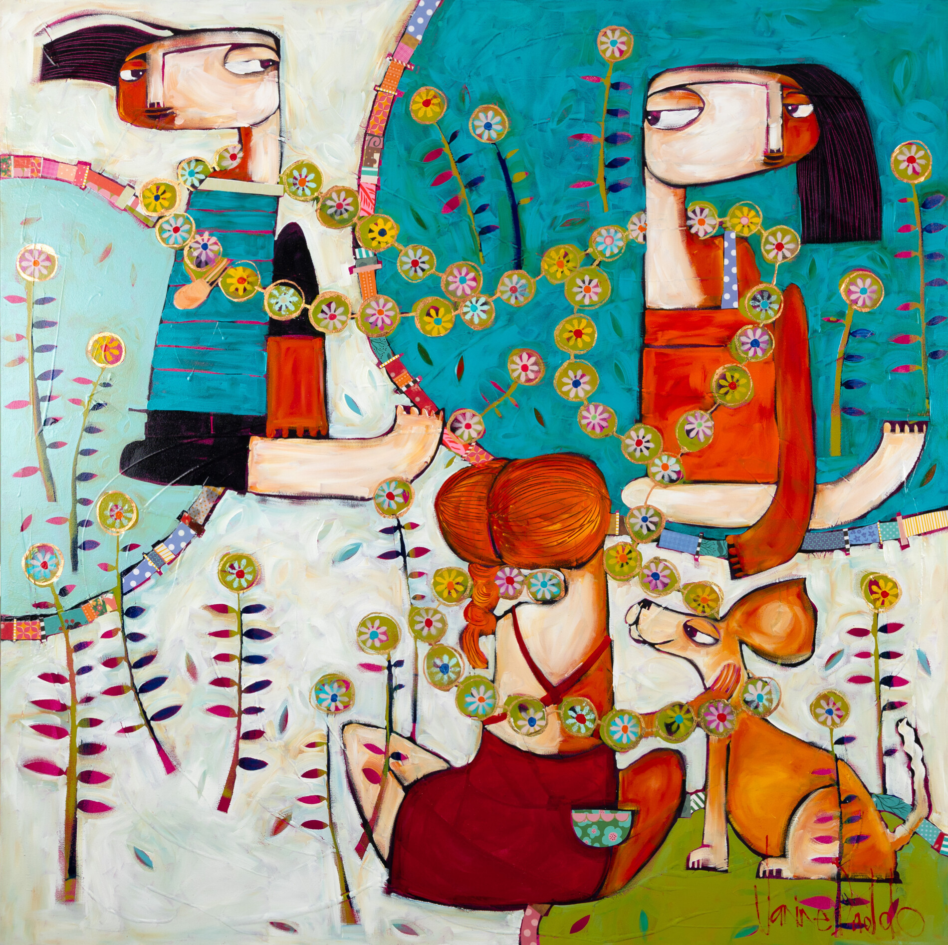 Un intreccio di margherite lega una famiglia in un momento di gioco e complicità. I colori vivaci, i volti sorridenti e il cane curioso raccontano una gioia quotidiana, fatta di semplicità e amore. La scena trasmette un senso di armonia giocosa.