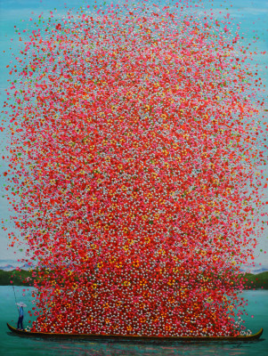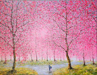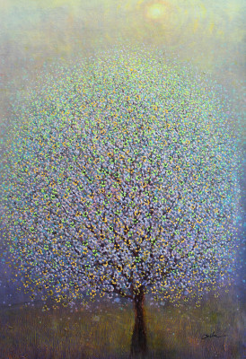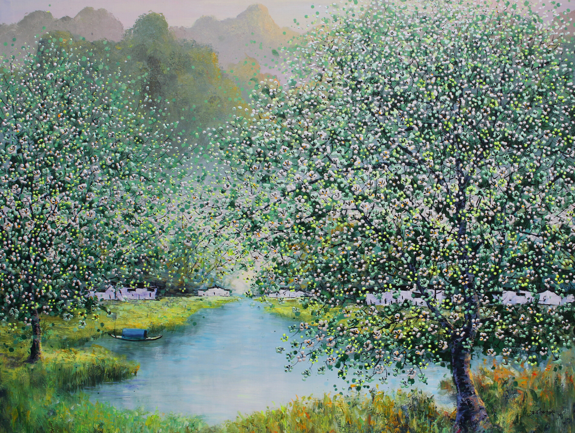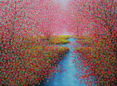 In Meditation 512, Je Shen crea un paesaggio di pura serenità: un fiume quieto attraversa una valle immersa nel verde, incorniciato da alberi in fiore resi con la sua inconfondibile tecnica puntiforme. Le delicate sfumature pastello e la luce soffusa evocano un’atmosfera meditativa, trasformando questa scena bucolica in un invito alla calma e alla contemplazione.