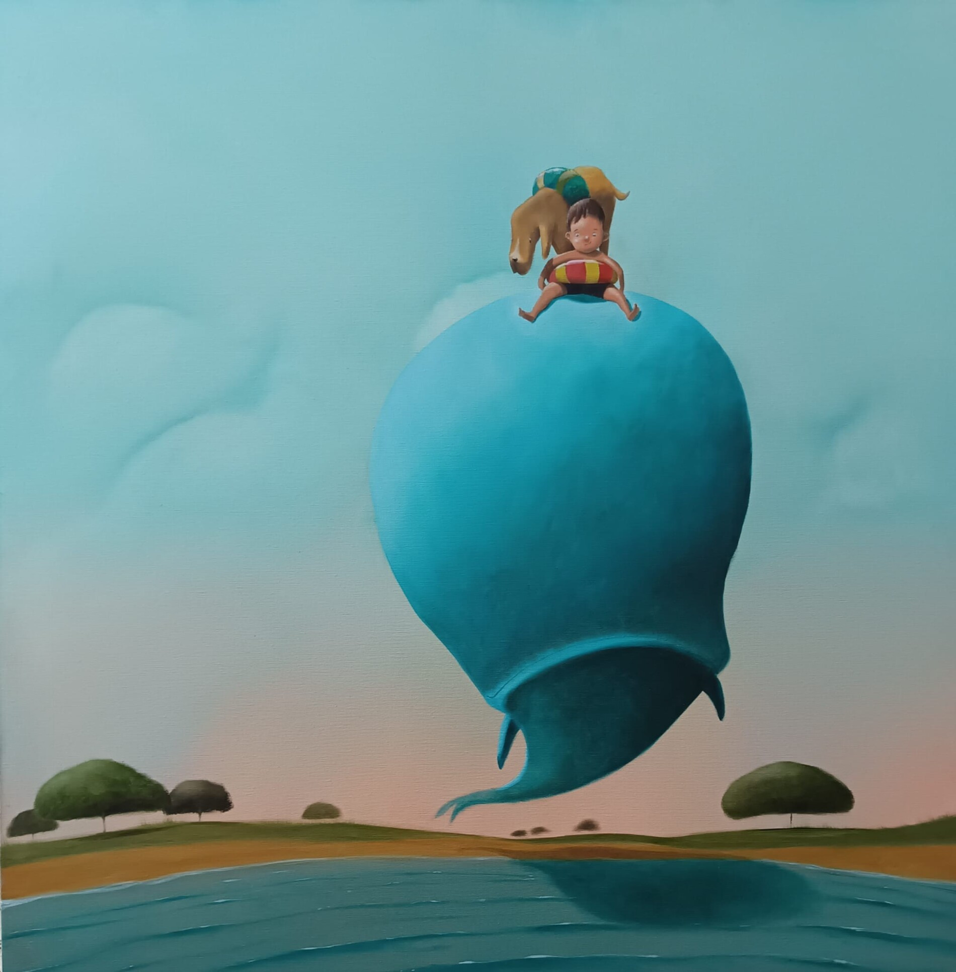 Sospeso tra cielo e acqua, un bambino si lascia trasportare dal dorso morbido di una creatura immaginaria, insieme al suo migliore amico. La scena racconta quel momento fragile e prezioso che precede ogni partenza: l’attimo in cui si raccoglie il coraggio e si sceglie di fidarsi.