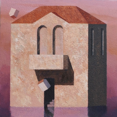 In questo grande olio su tela, Matthias Brandes ci conduce su una terrazza che si affaccia su un villaggio di case irregolari, raccolte come in un mosaico imperfetto. Sullo sfondo, un mare quieto e un cielo azzurro si incontrano in un orizzonte limpido, creando un’atmosfera serena ma anche misteriosa.