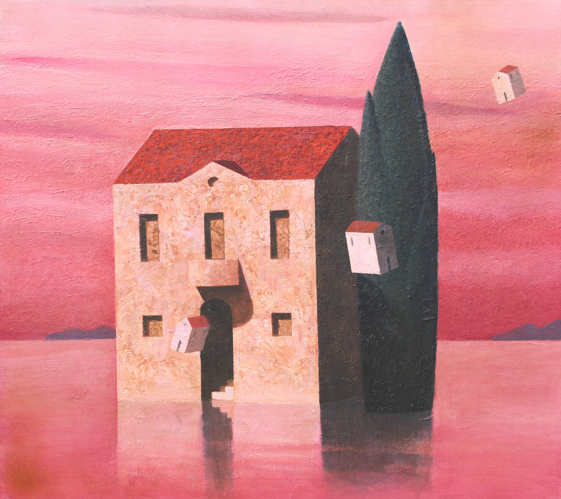 Un edificio emerge dall’acqua calma, illuminato da una luce che ne ammorbidisce i contorni e ne rivela la calma interiore. Attorno a lui, piccole case sospese attraversano il cielo come pensieri leggeri, aprendo la scena a una dimensione immaginativa e serena. Brandes crea così un luogo di silenziosa armonia, dove l’immobilità diventa possibilità e il paesaggio si trasforma in un invito alla quiete e alla contemplazione.