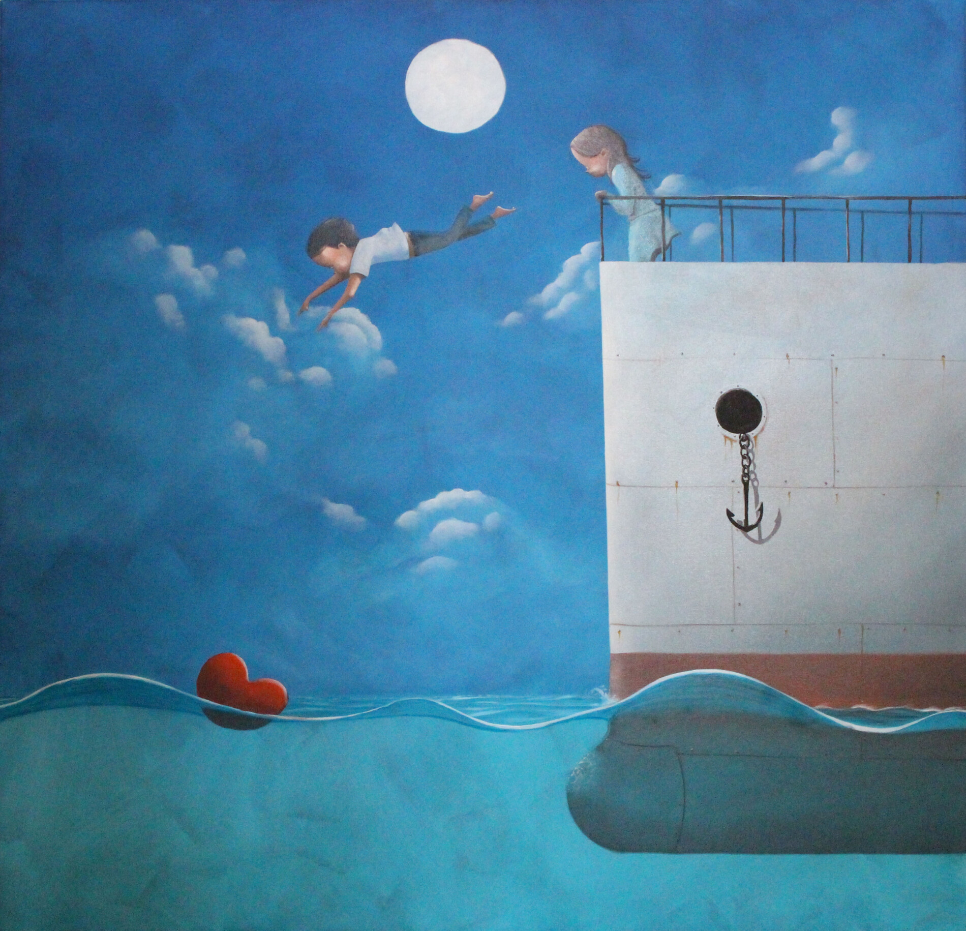 In questo suggestivo olio su tela, Diego Santini mette in scena un gesto di coraggio puro e istintivo: un bambino si lancia oltre il bordo di una grande nave per raggiungere un piccolo cuore rosso che galleggia tra le onde, fragile ma luminoso come un tesoro da proteggere.