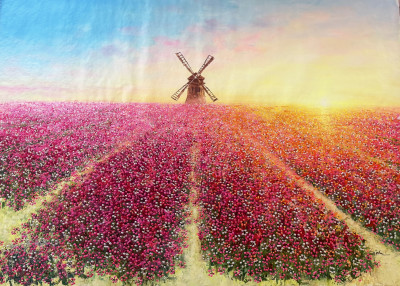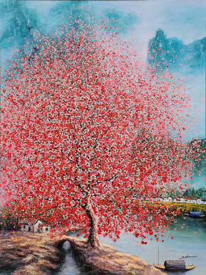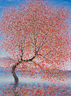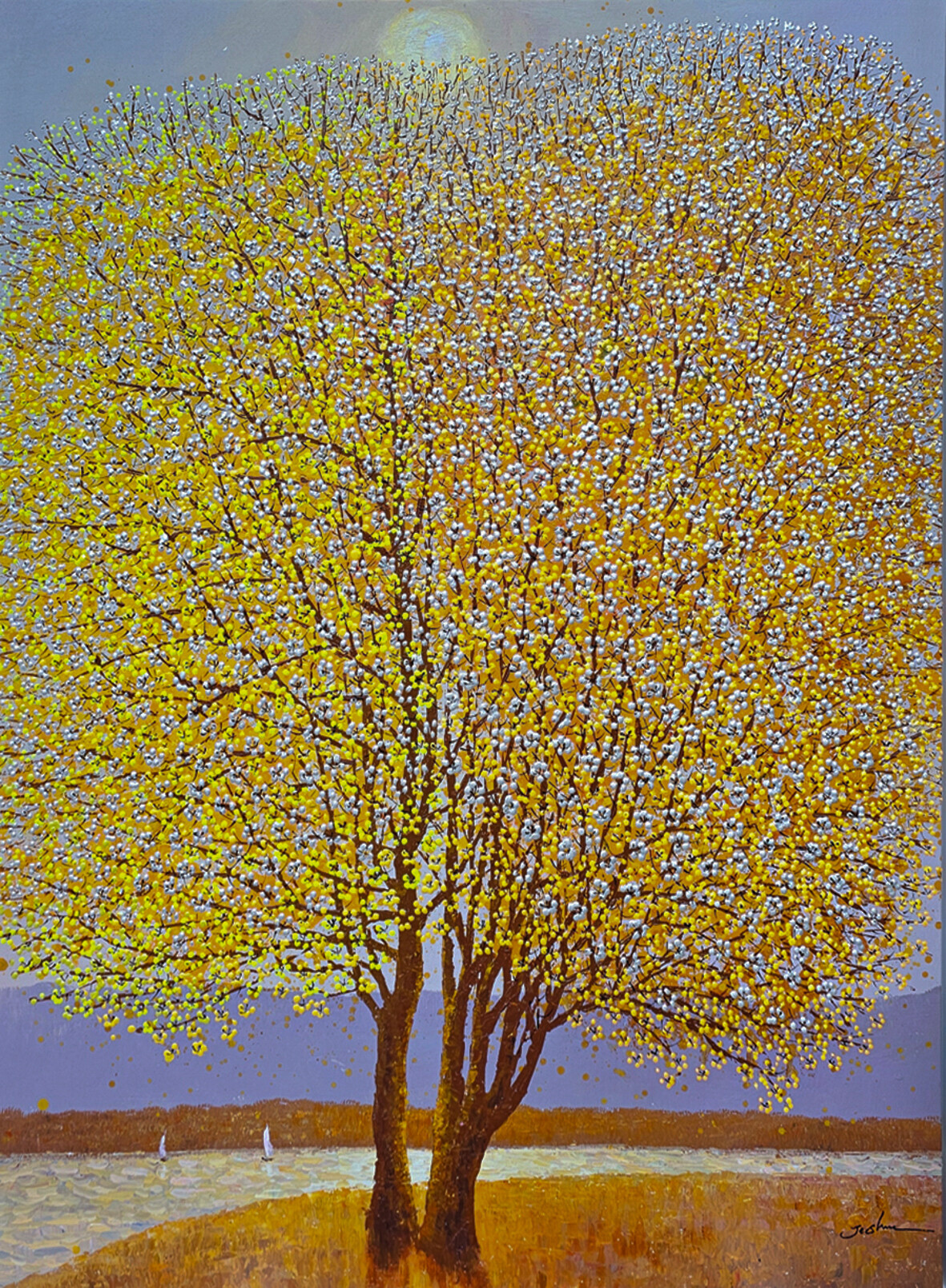 In questo dipinto, una spiaggia dorata si apre all’orizzonte, immersa in una luce calda e silenziosa. Al centro, l’albero si espande in una fioritura luminosa, mentre una figura osserva la scena in modo assorto, come sospesa in un momento di quiete.