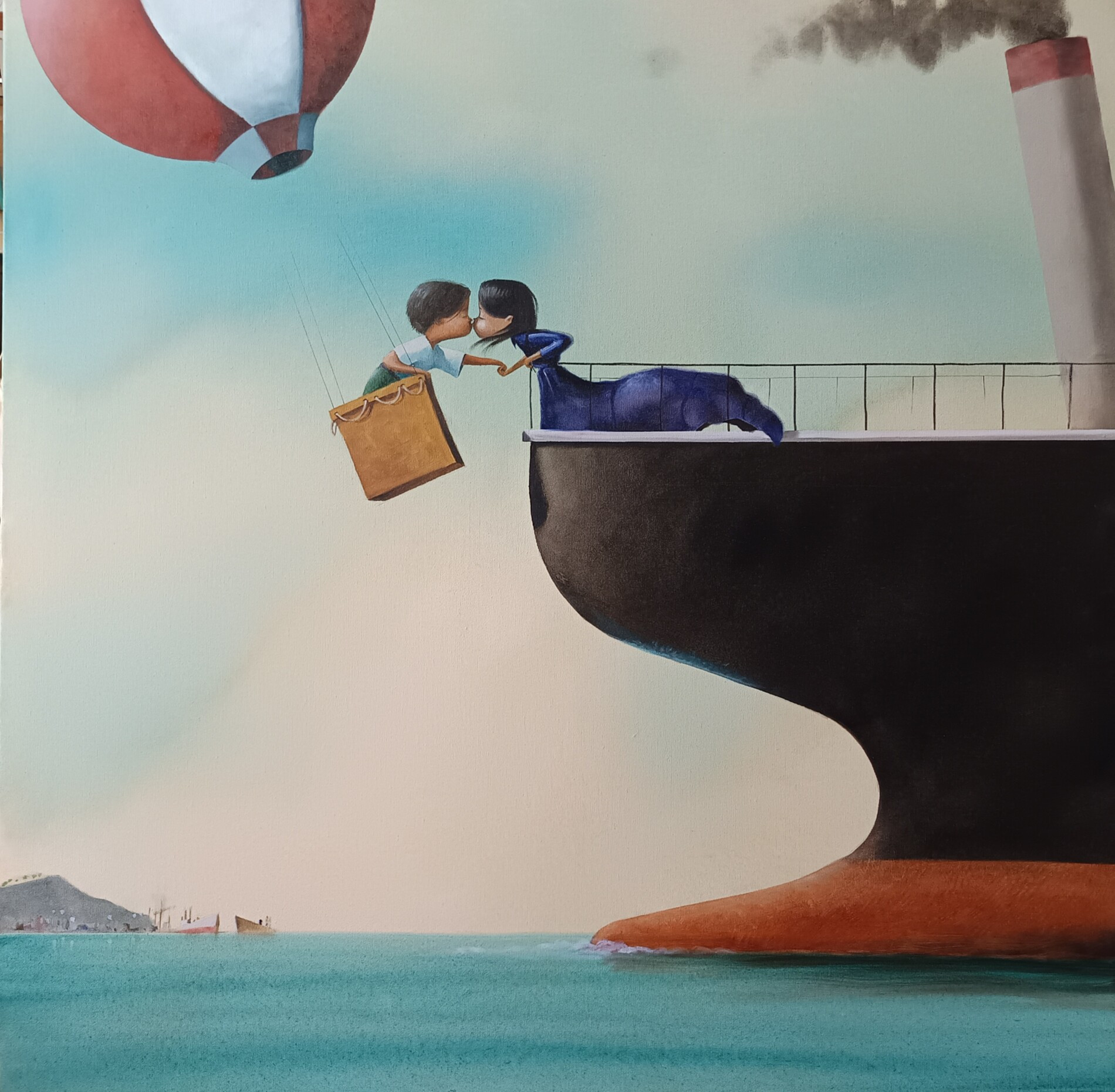 Un bacio sospeso tra cielo e mare: un bambino su una mongolfiera e una bambina affacciata al ponte di una nave si protendono l’uno verso l’altra, come se il mondo per un istante trattenesse il respiro. Nelle visioni di Santini, l’amore è slancio e leggerezza, ma anche distanza, attesa e desiderio. I colori soffusi e l’atmosfera fiabesca avvolgono la scena in una tenerezza che commuove, trasformandola in un sogno luminoso intriso di speranza.
