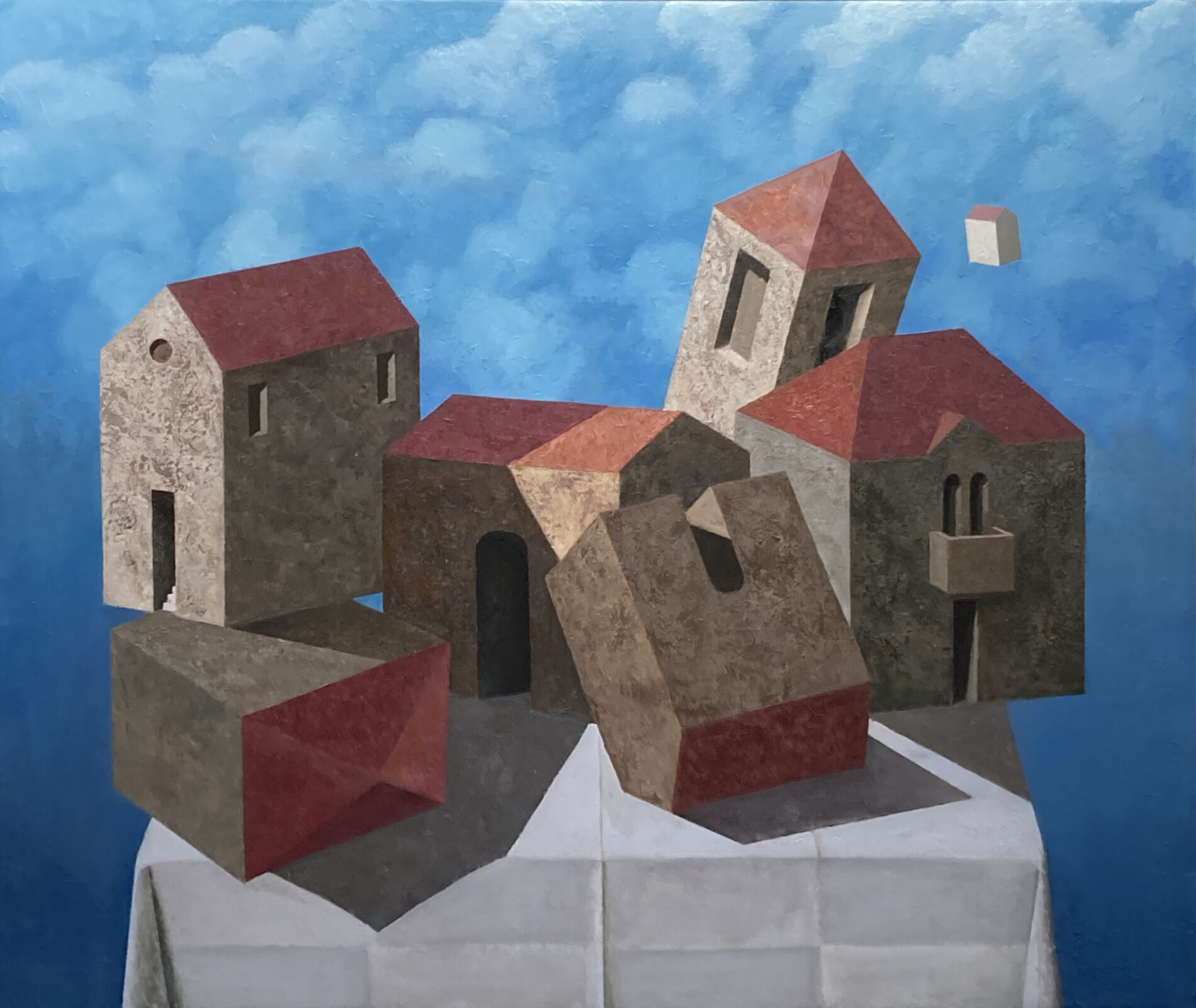 Un intero villaggio posato su un tavolo, come il modello in miniatura di un mondo sospeso. Village on Table invita a riflettere sul rapporto tra spazio e scala e sulla delicata fragilità delle costruzioni umane. Le case sembrano precarie ma al tempo stesso eterne, come se appartenessero a un racconto fuori dal tempo. L’equilibrio tra gioco e serietà rende l’opera un enigma affascinante, una finestra aperta sulla nostra percezione della realtà.