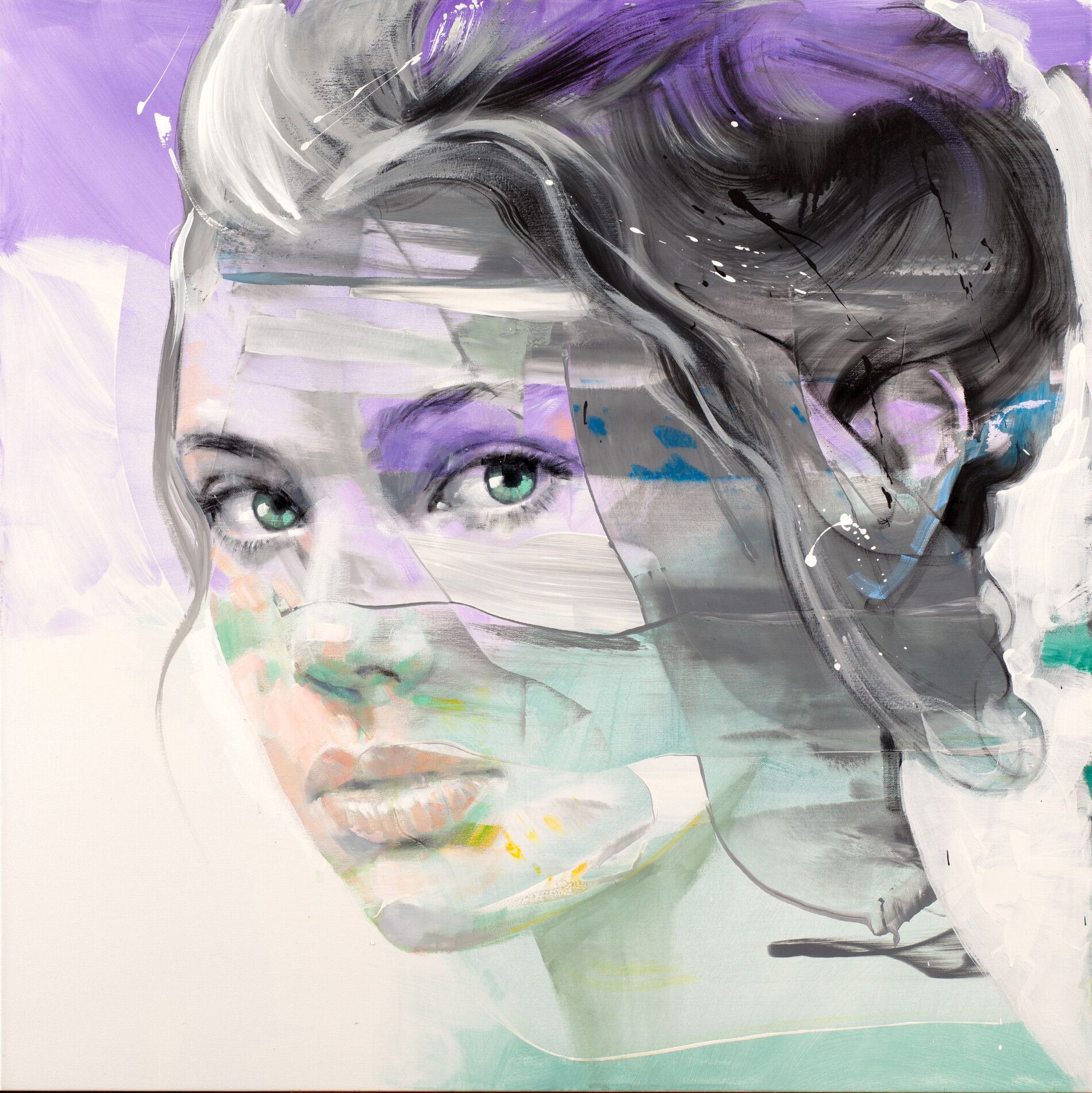 Uno sguardo che affiora tra velature trasparenti e gesti fluidi. Il volto si frammenta e si ricompone in una danza di colori delicati, dove il viola e il verde creano un’atmosfera sospesa e luminosa. Un ritratto etereo e moderno, che cattura l’istante tra presenza e dissolvenza.
