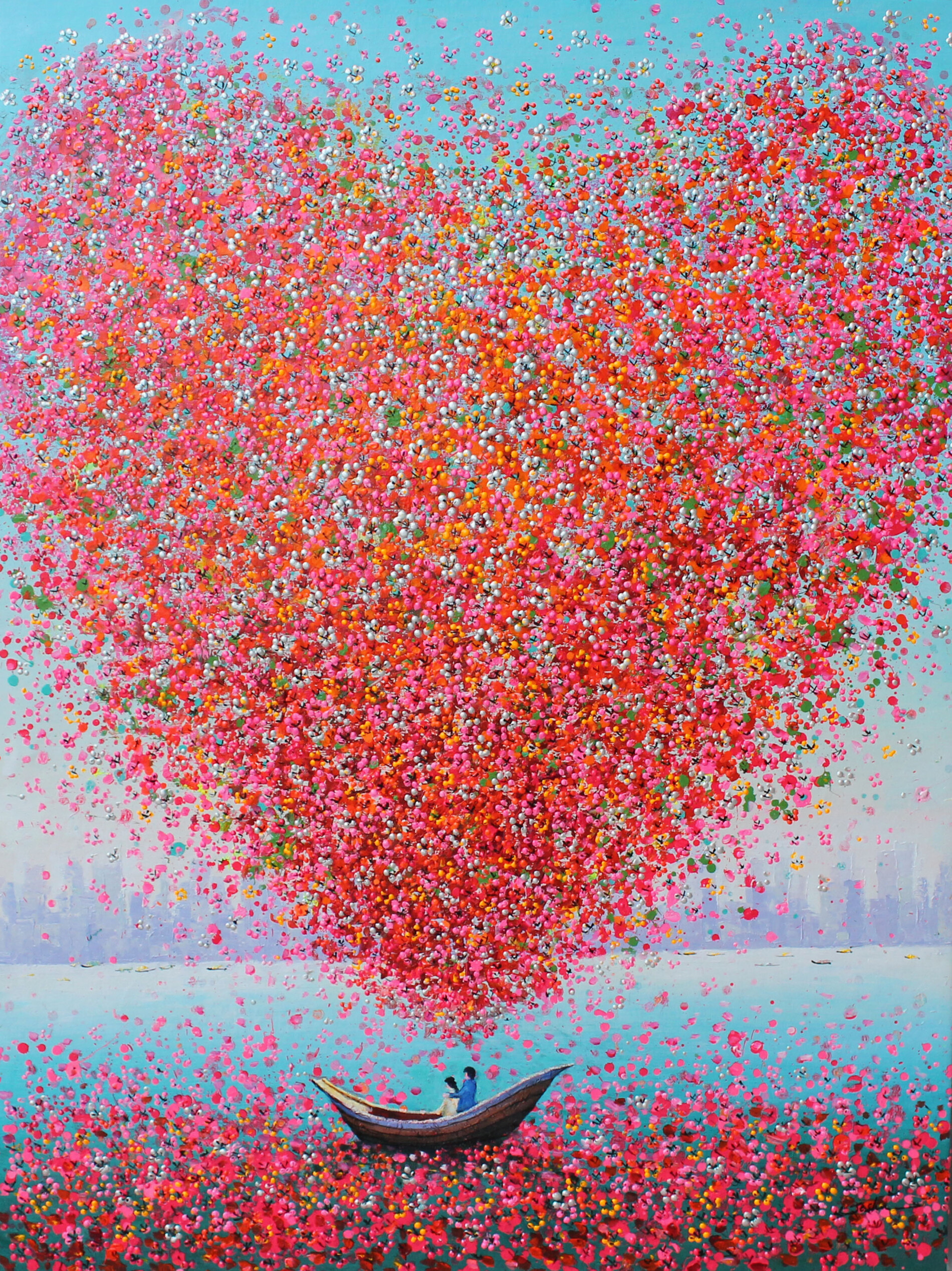 Sospesi sulla barca simbolo di Je Shen, due innamorati si lasciano avvolgere da un attimo eterno. Attorno a loro, migliaia di petali colorati si raccolgono a formare un grande cuore che si apre verso il cielo in un’esplosione di emozione e colore. Sullo sfondo, una metropoli appena accennata si dissolve nella quiete della scena, creando un equilibrio perfetto tra natura e città, contemplazione e stupore.