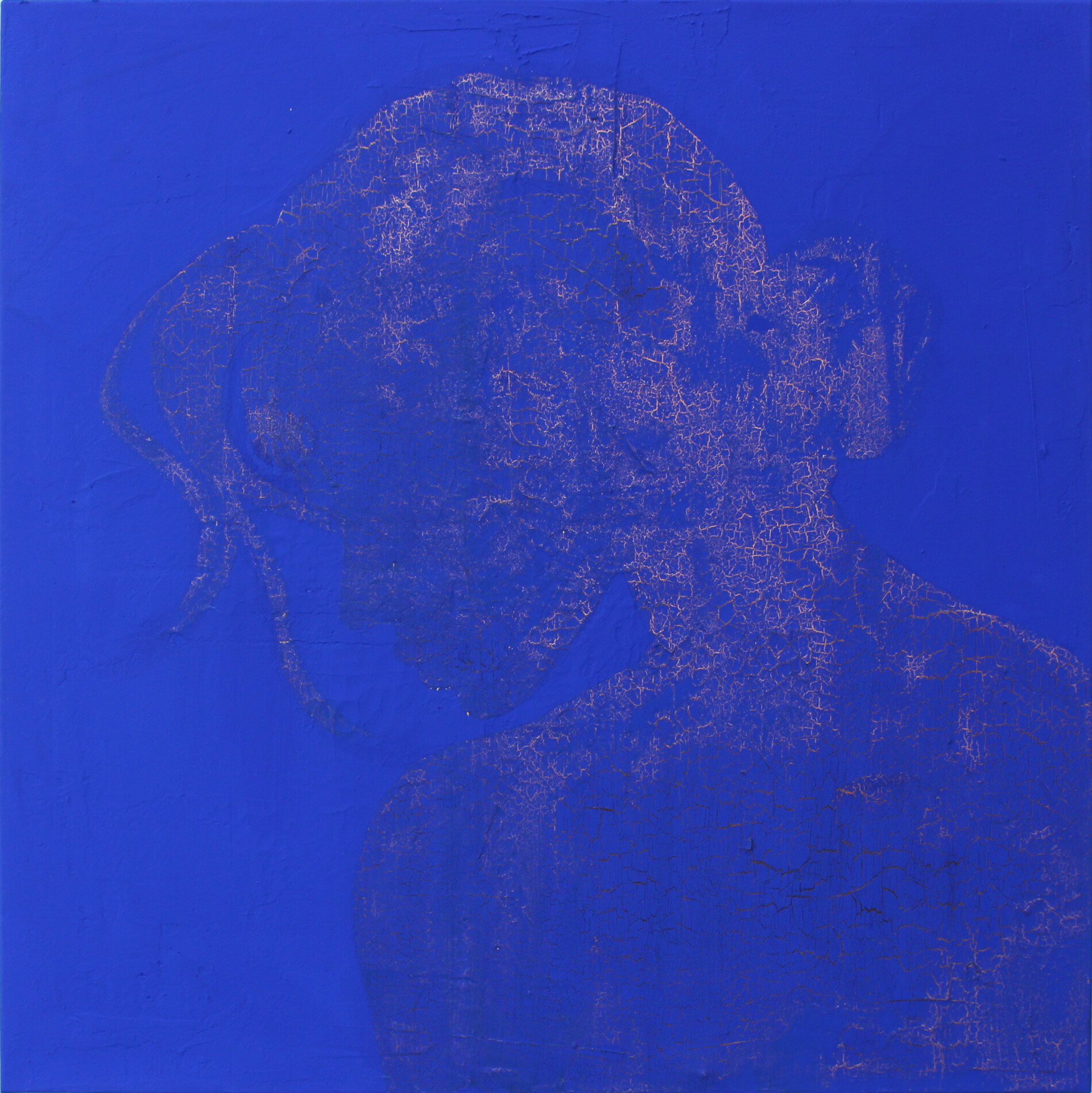 In questa composizione di medie dimensioni, Ramona Russu lascia che la figura affiori appena dal blu assoluto, come un pensiero che non vuole essere rivelato. Le crepe dorate, sottilissime, tracciano un volto e un corpo chinato, rivelando la presenza più attraverso la luce che attraverso il disegno. Un’opera che cattura l’essenza del fragile: ciò che appare solo quando lo si guarda con attenzione.