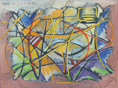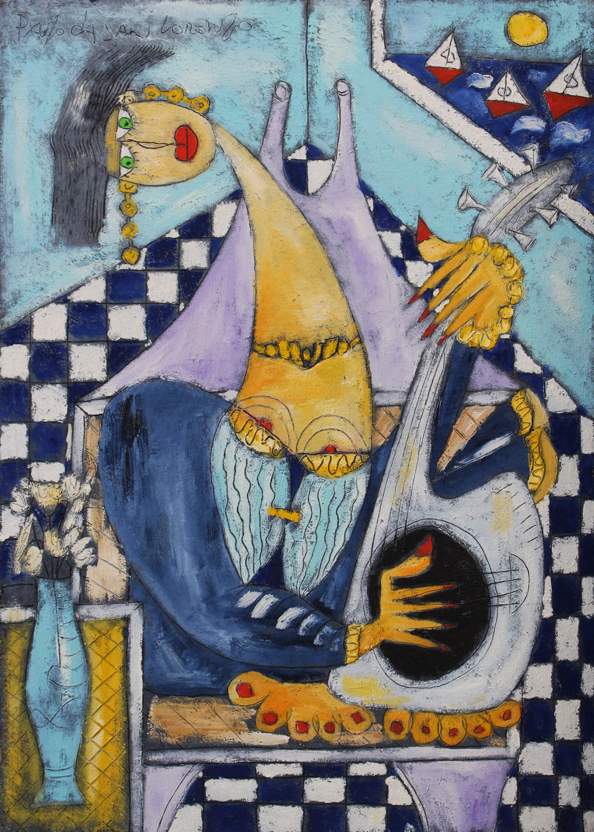 In Gitana, Paolo da San Lorenzo evoca la figura nomade e misteriosa della zingara con una composizione ricca e simbolica. La protagonista emerge da un fondo dominato da azzurri luminosi, blu intensi e contrasti di giallo e bianco, creando un’atmosfera vivace e sospesa. La materia pittorica appare spessa e vibrante, mentre le linee graffiate suggeriscono movimento e passione, rendendo l’immagine viva e pulsante. Un’opera che racconta libertà, identità e forza femminile.