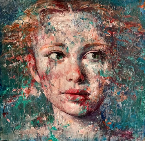 In questo ritratto Michelino Iorizzo approfondisce la sua ricerca sulla figura come luogo di introspezione. Il volto della protagonista emerge da una superficie pittorica ricca di stratificazioni, dove il colore viene lavorato, graffiato e lasciato affiorare in modo istintivo. Questa composizione racconta un momento di quiete interiore in cui lo sguardo, leggermente distolto, invita l’osservatore a una lettura intima e contemplativa.