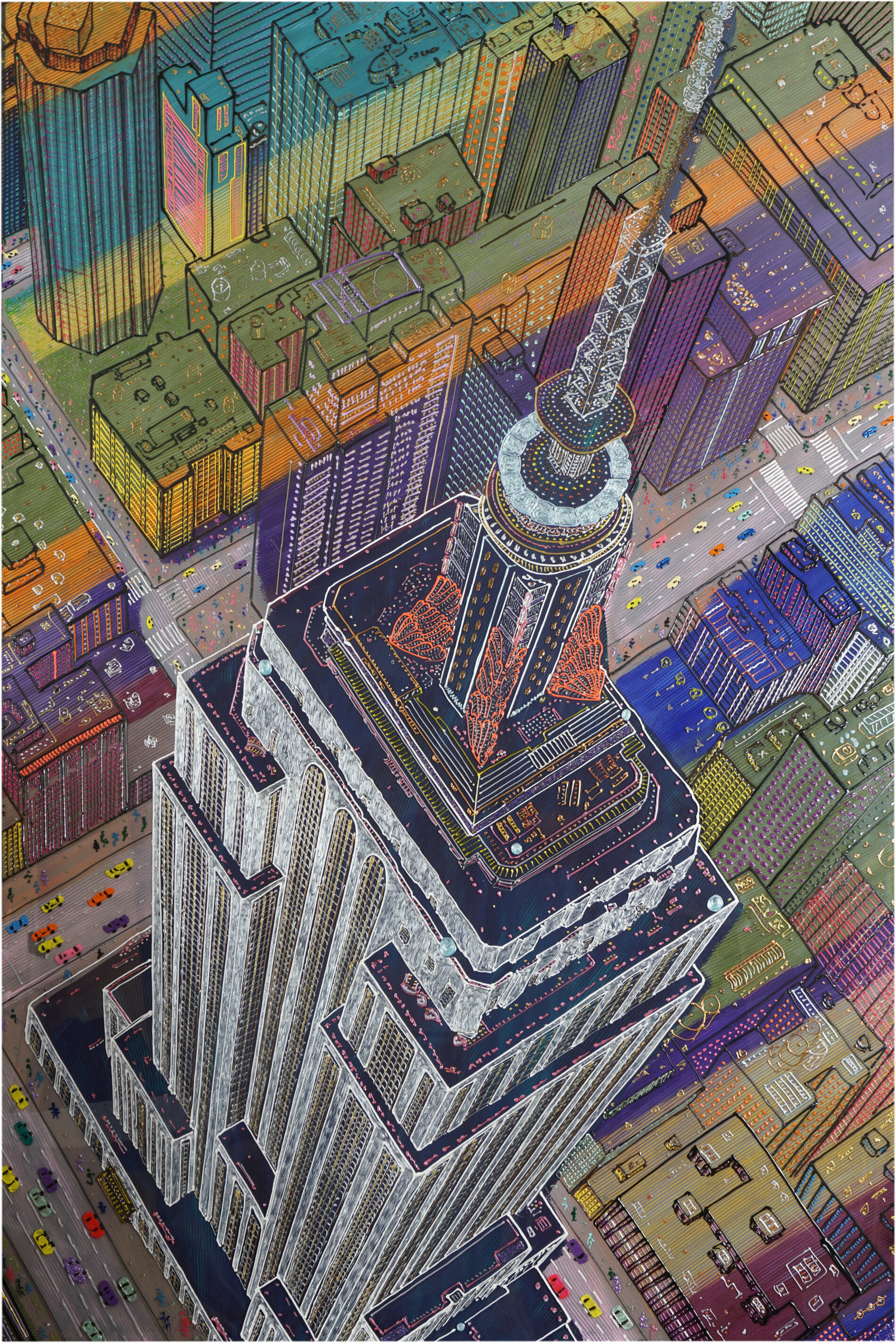L’Empire State Building domina la scena come se fosse visto da un drone lanciato nel cuore di Manhattan. La città è compressa in un mosaico fitto: traffico, colori, geometrie che si incastrano senza pause.