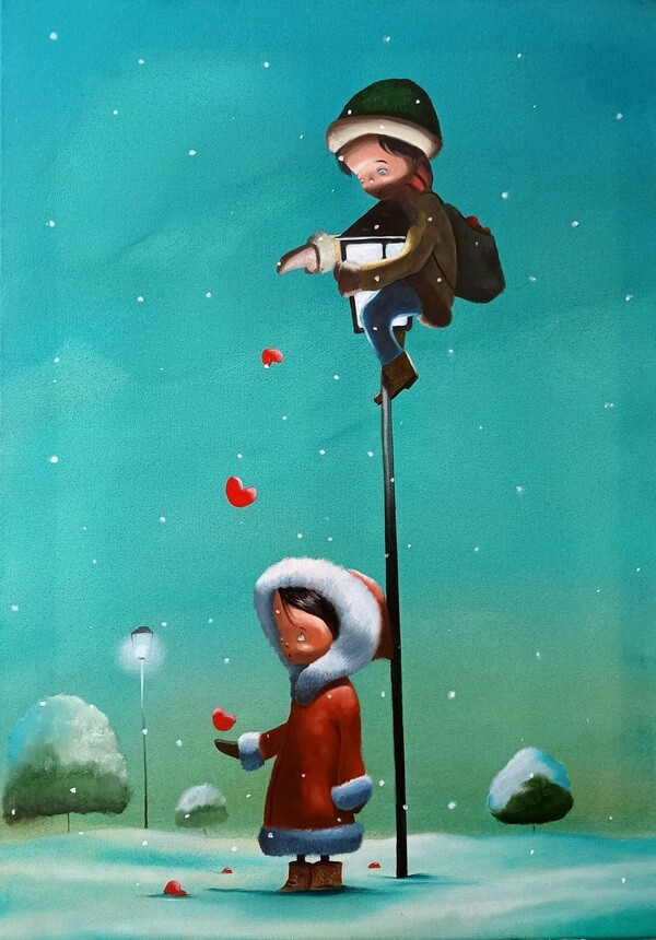 In una tranquilla notte d’inverno, tra neve lieve e luce soffusa, due bambini si scambiano piccoli gesti capaci di scaldare più di qualsiasi mantello. Dall’alto di un lampione, uno di loro lascia cadere minuscoli cuori rossi, mentre l’altro li raccoglie con meraviglia, come fossero scintille di calore. Santini ritrae la delicatezza di un affetto semplice e genuino: quel calore dell’anima che sa illuminare anche la notte più fredda.